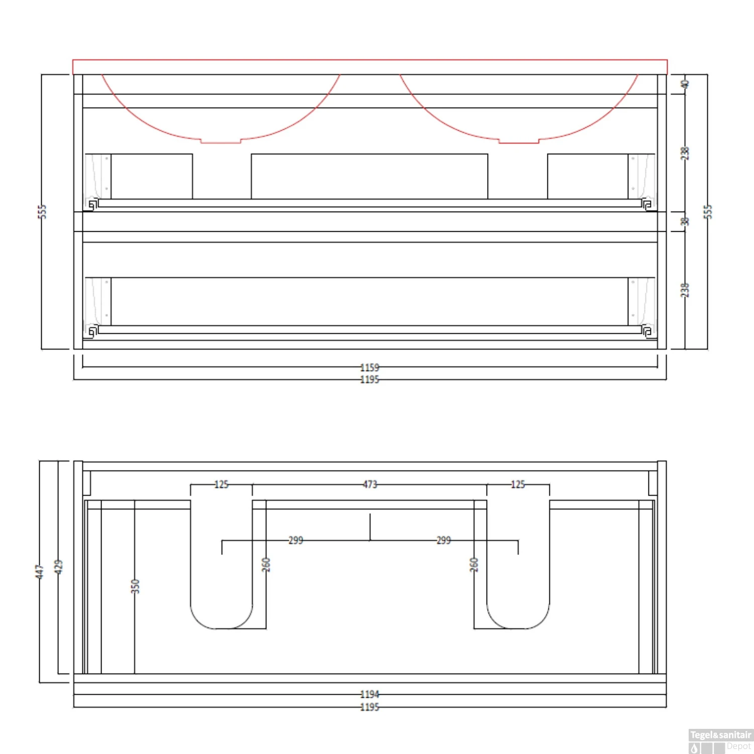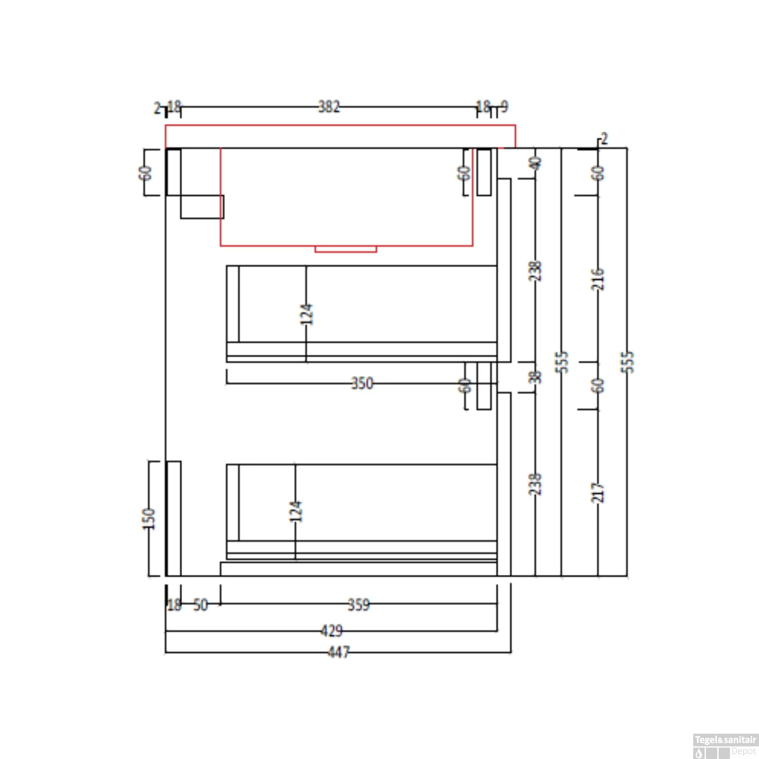 Belangrijk! Dit badmeubel wordt standaard geleverd exclusief kraan, spiegel en sifon: deze artikelen dient u apart bij te bestellen om het meubel compleet te maken. De overloop zit niet in het midden van de wastafel i.v.m. te weinig ruimte voor de montage van de kraan.