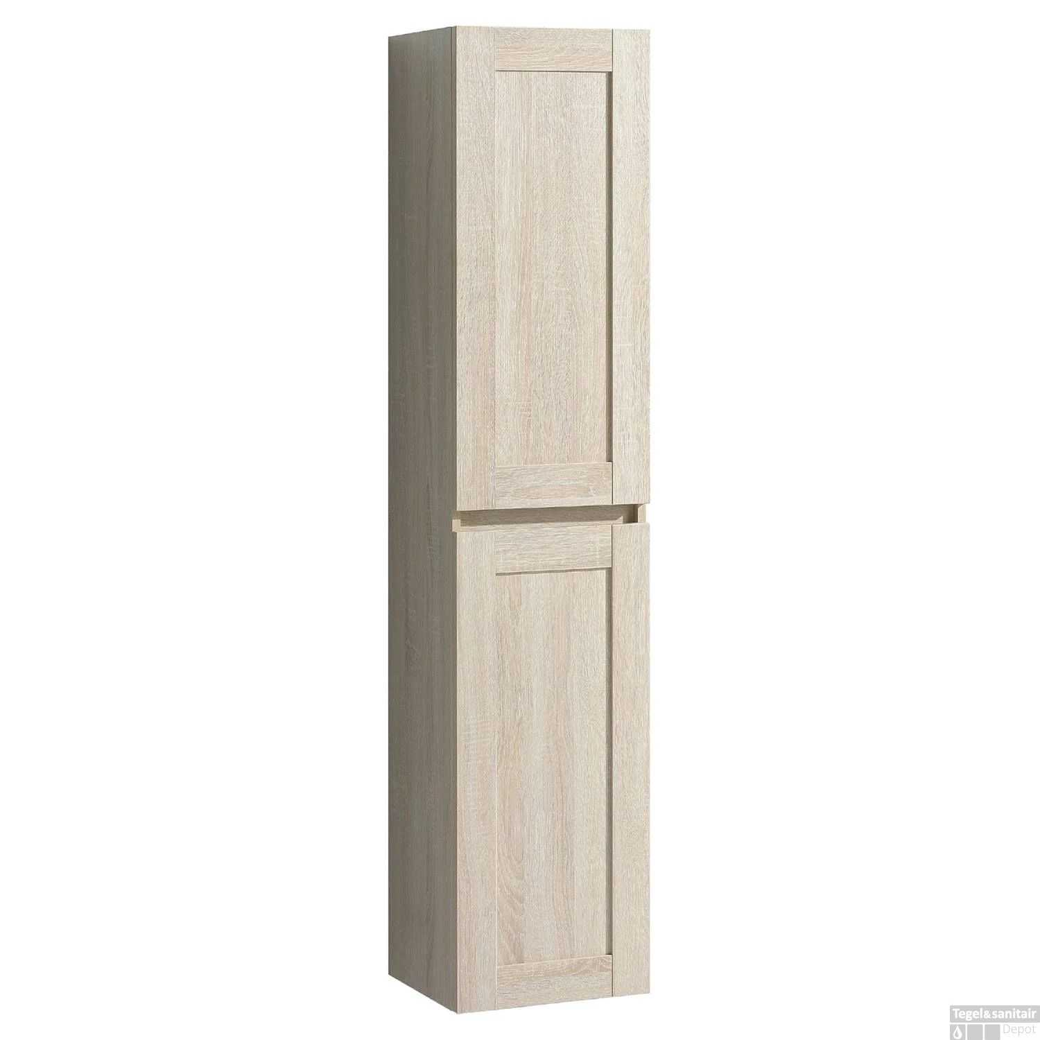 De hoge kast Reno is 160cm hoog, 32cm breed en 35cm diep. De kast heeft 2 softclose deuren en ruimte voor 4 legplanken.
