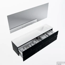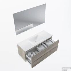 Deze badkamermeubelset wordt standaard geleverd zonder kraan, sifon, afvoer en badkamerspiegel. Deze artikelen dient u apart bij te bestellen om de meubelset compleet te maken. Onderaan de webpagina heeft u echter de keuze uit drie bijpassende badkamerspiegels en een clickwaste om aan uw bestelling toe te voegen.