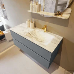 Het Madrid badkamermeubel is van ons eigen merk Boss & Wessing en is een stijlvolle toevoeging aan uw badkamerruimte. Het meubel wordt standaard geleverd met een onderkast en een bijpassende wastafel. De onderkast heeft een breedte van 150 cm, een diepte van 45 cm en een hoogte van 30 cm en dient aan de muur bevestigd te worden. De kast is gemaakt van porselein en afgewerkt in de kleur carrara mat. De onderkast is uitgerust met twee lades waarin u diverse badkamerartikelen kwijt kunt.