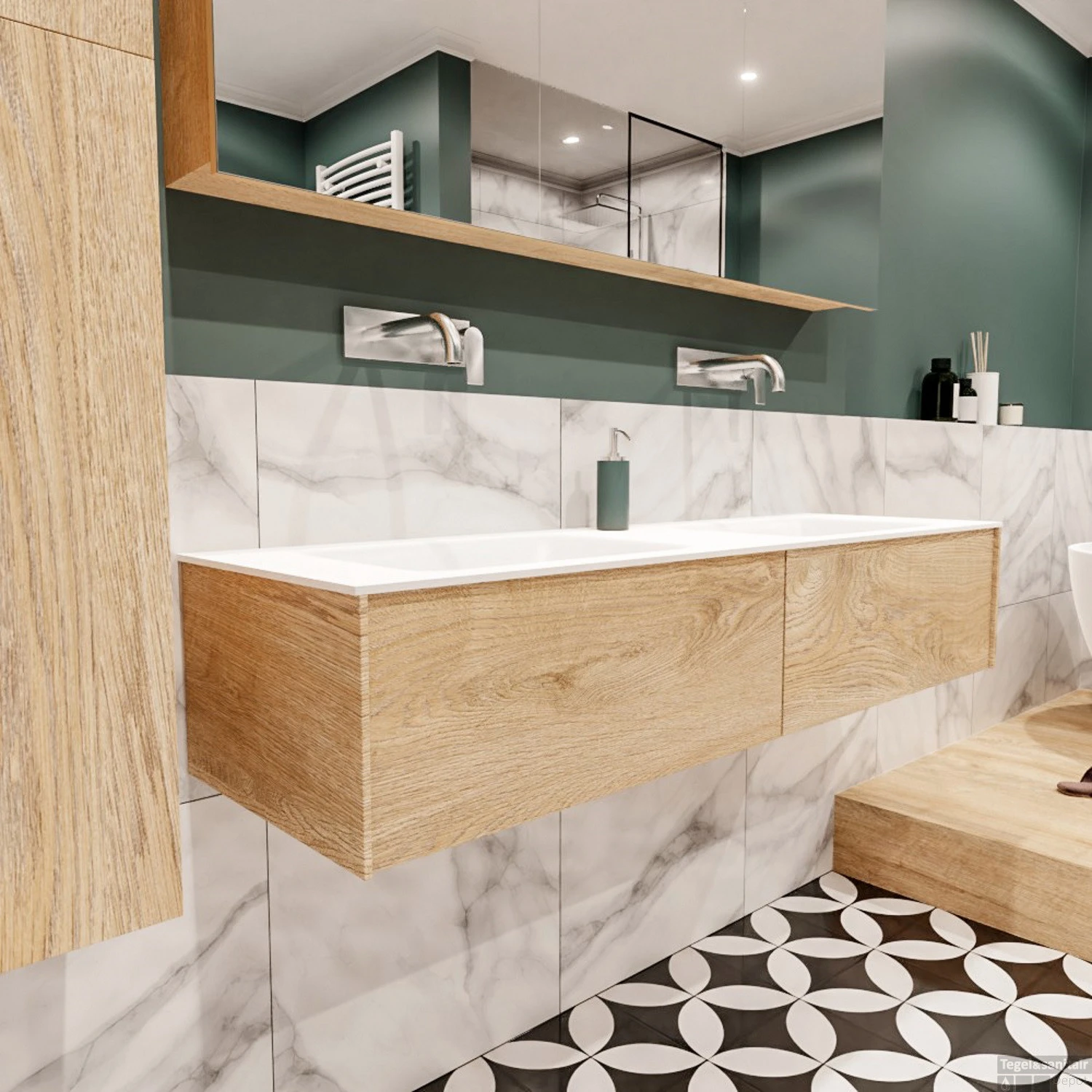 Het Madrid badkamermeubel is van ons eigen merk Boss & Wessing en is een stijlvolle toevoeging aan uw badkamerruimte. Het meubel wordt standaard geleverd met een onderkast en een bijpassende dubbele wastafel. De onderkast heeft een breedte van 150 cm, een diepte van 45 cm en een hoogte van 30 cm en dient aan de muur bevestigd te worden. De kast is gemaakt van melamine en afgewerkt in een fraaie ‘washed oak’ kleur. De onderkast is uitgerust met twee lades waarin u diverse badkamerartikelen kwijt kunt.