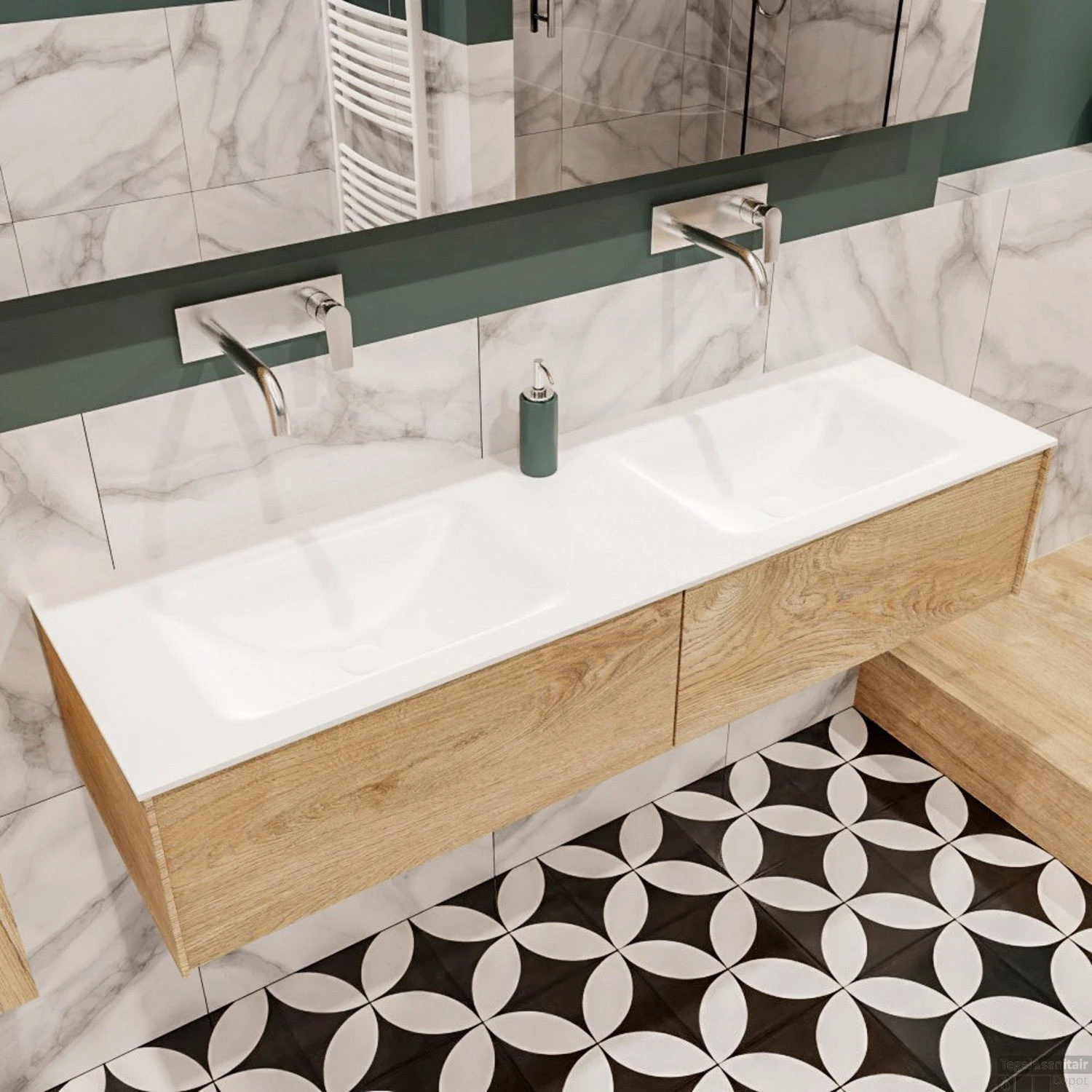 Bovenop de onderkast bevestigt u de dubbele inbouw wastafel. Deze dubbele wastafel is wit van kleur en is gemaakt van solid surface. Solid surface is uitstekend geschikt om sanitaire producten van te maken omdat het geen poriën en naden heeft. Solid Surface is een composiet, geproduceerd uit mineralen en harsen. Bovendien is dit materiaal bestendig tegen vocht, vlekken, en zelfs chemische stoffen. Er trekt dus niets in, het is niet poreus, heeft een intense kleur én is gemakkelijk schoon te houden.