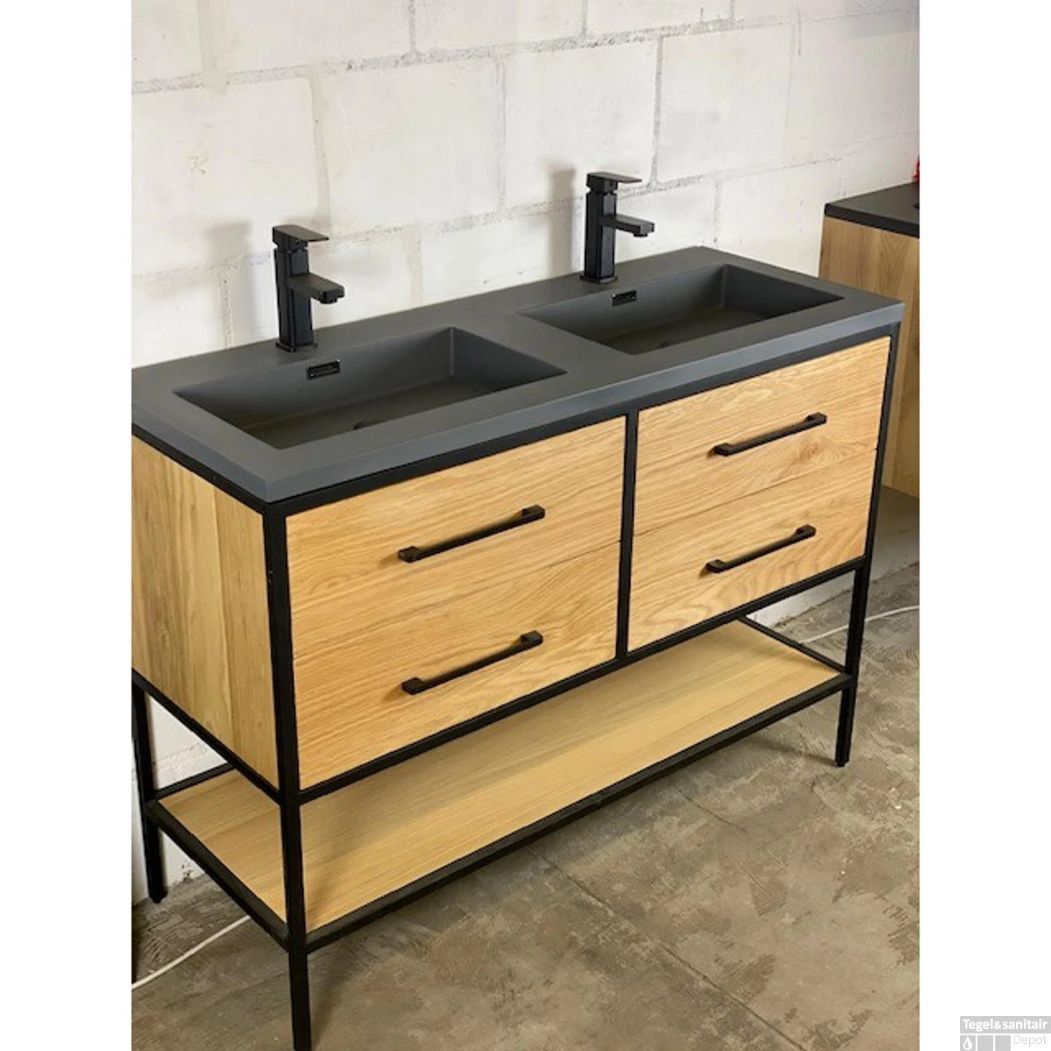 Het badmeubel heeft een breedte van 120 cm, een diepte van 46 cm en een hoogte van 90 cm. De industriële look van het meubel wordt benadrukt door het zwarte RVS frame om het meubel heen en de zwarte greepjes van de lades. Het meubel wordt geleverd met 4 soft-close lades, waardoor deze nooit meer hard zullen dichtvallen. Het wastafelblad is gemaakt van kunstmarmer. Kunstmarmer is een soort composiet door middel van kunstharsen waardoor het materiaal geen poriën bevat. Hierdoor is de wastafel waterdicht en kan vuil zich niet hechten.