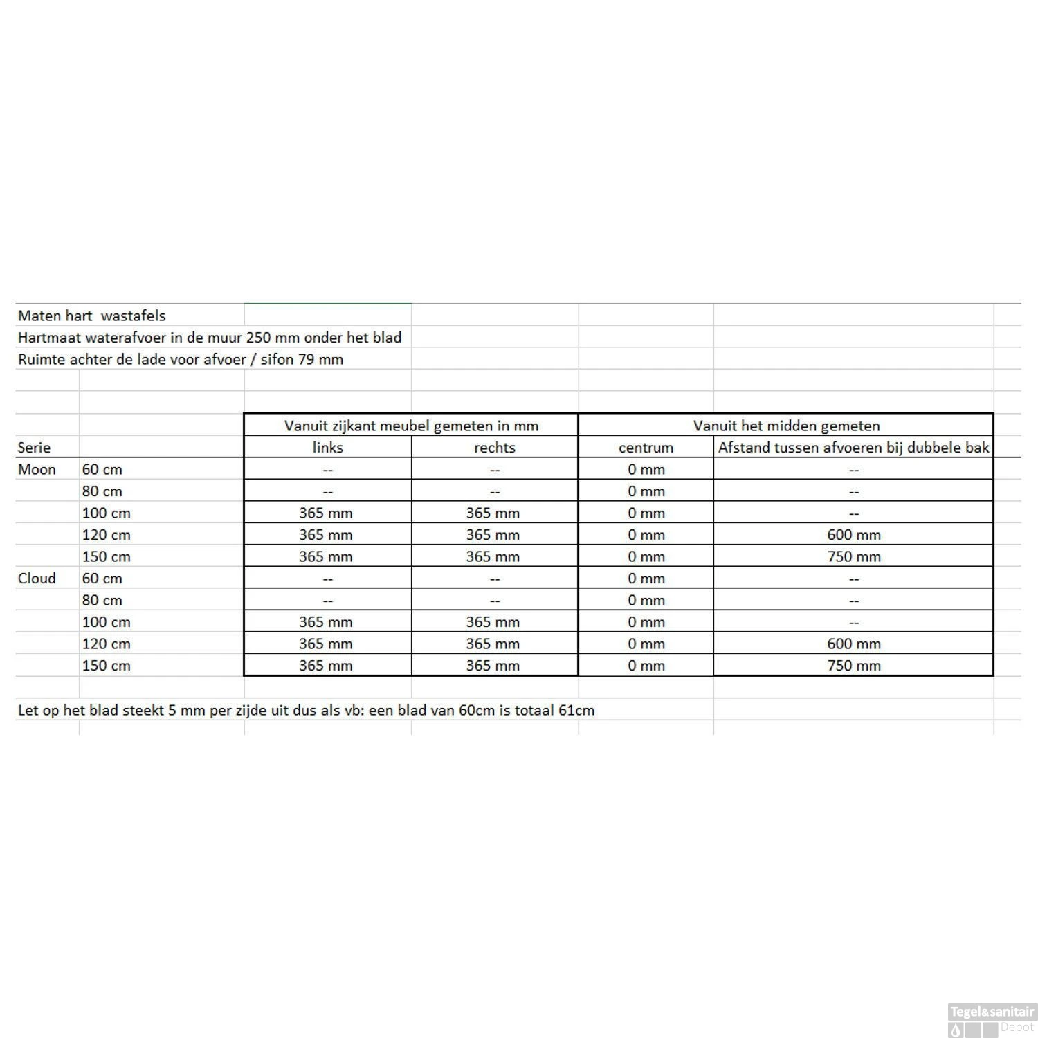 De wastafel is verkrijgbaar met een spoelbak in het midden, links of rechts. Vanaf 120cm breedte, kan de wastafel ook voorzien zijn van een dubbele spoelbak.