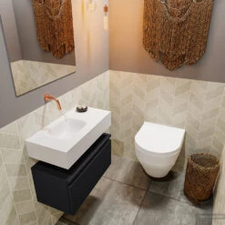 MONDIAZ ANDOR 40cm Toiletmeubel Washed Oak. LEX 80cm Wastafel Talc Links Geen Kraangat