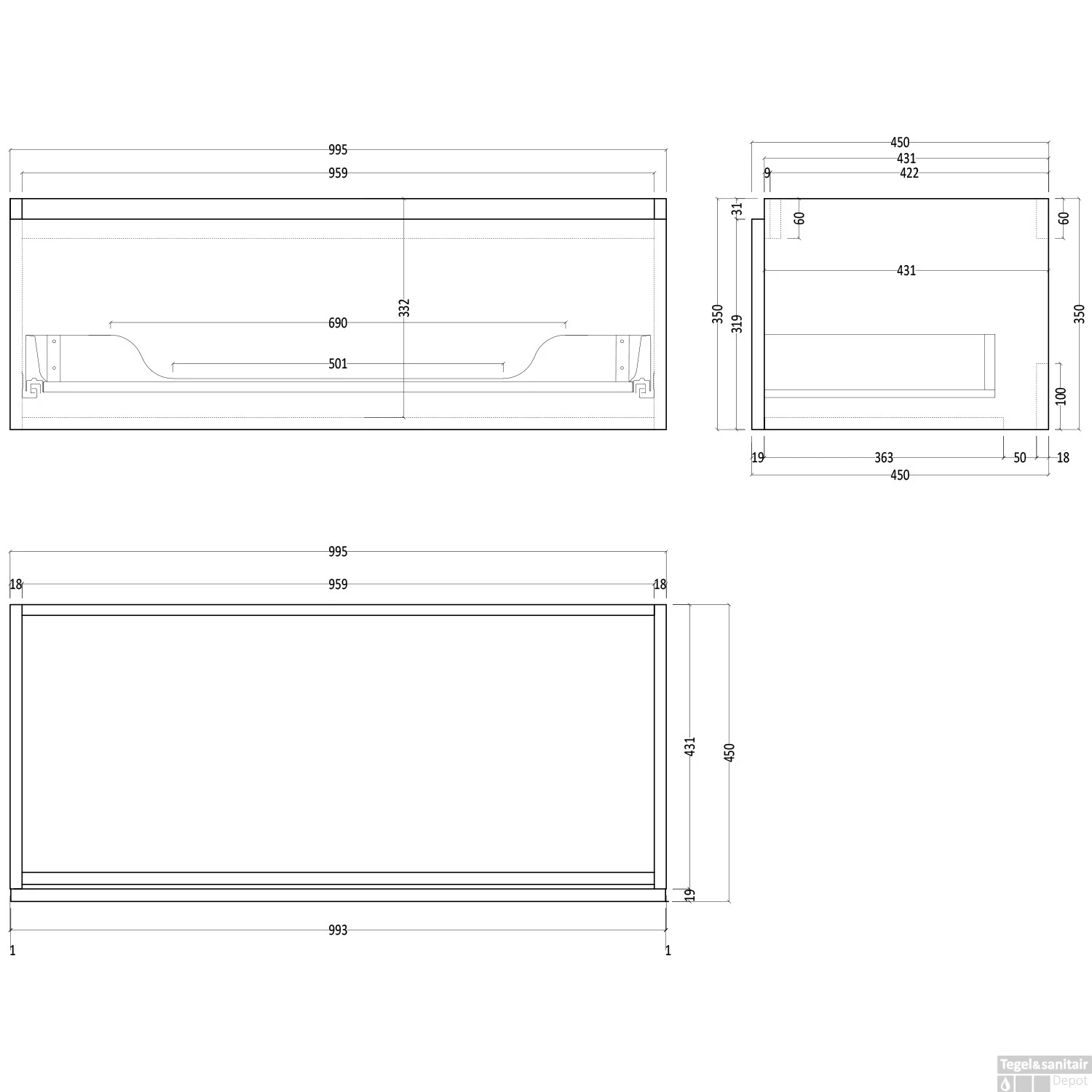 De onderkast heeft 1 grote lade die u kunt openen en sluiten met het softclose blumsysteem wat erin verwerkt zit. De onderkast heeft een hoogte van 35 cm en een diepte van 45 cm. De lade is niet voorzien van een sifon uitsparing.