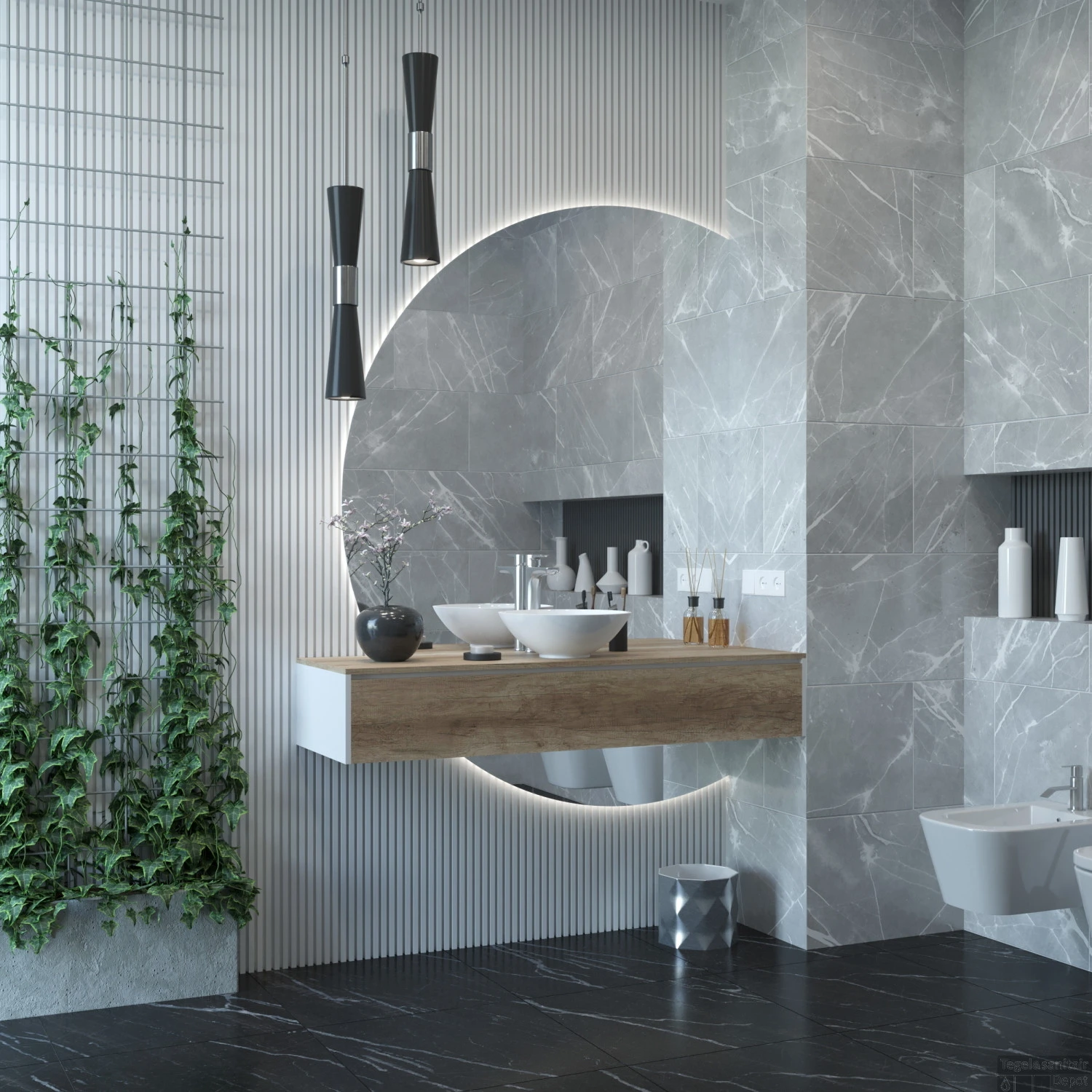 De spiegel bestaat uit twee delen. Deze kunt u om het wastafelmeubel heen plaatsen, waardoor het lijkt alsof het meubel zweeft op de spiegel.