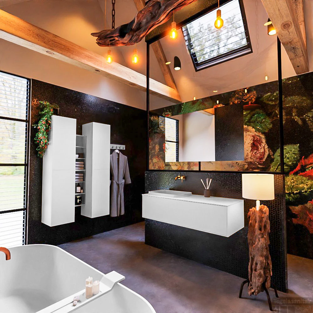 De inleg wastafel heeft een opstaande rand met een extra grote en diepe waskom. De ronde vormen van de waskom stralen een luxe zachtheid uit. De plek van de wastafelkraan op de hoek van de waskom geeft een extra speels effect. Het badmeubel van de set ERIN heeft een push to open lade. Zo heeft het badmeubel een mooie en gestroomlijnde uitstraling passend voor in elke badkamerstijl. Het badmeubel op deze afbeeldingen is de ERIN 200cm met onderkast in de kleur Talc met 2 lade(s). In deze serie hebben wij al meer dan 2500 variaties voor jou samengesteld.