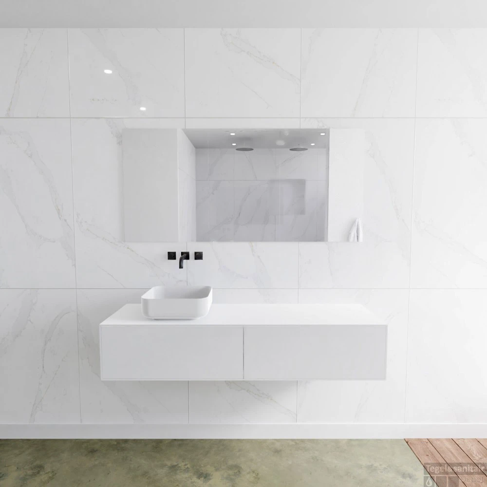 Badkamermeubelset Mondiaz LAGOM 150 cm met Topblad Linkse Wastafel Solid Surface Opzetkom Binx Zonder Kraangaten Mat Wit (2 laden)
