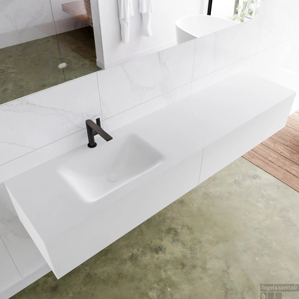 Het hangende badkamermeubel is gemaakt van solid surface. Dit meubel is 190 cm lang en heeft 2 lades die greeploos zijn. De lades kunnen worden geopend met een push-2-open systeem. De panelen zijn naadloos met elkaar verlijmd. Dit zorg voor een strakke en stijlvolle afwerking van uw badkamer.