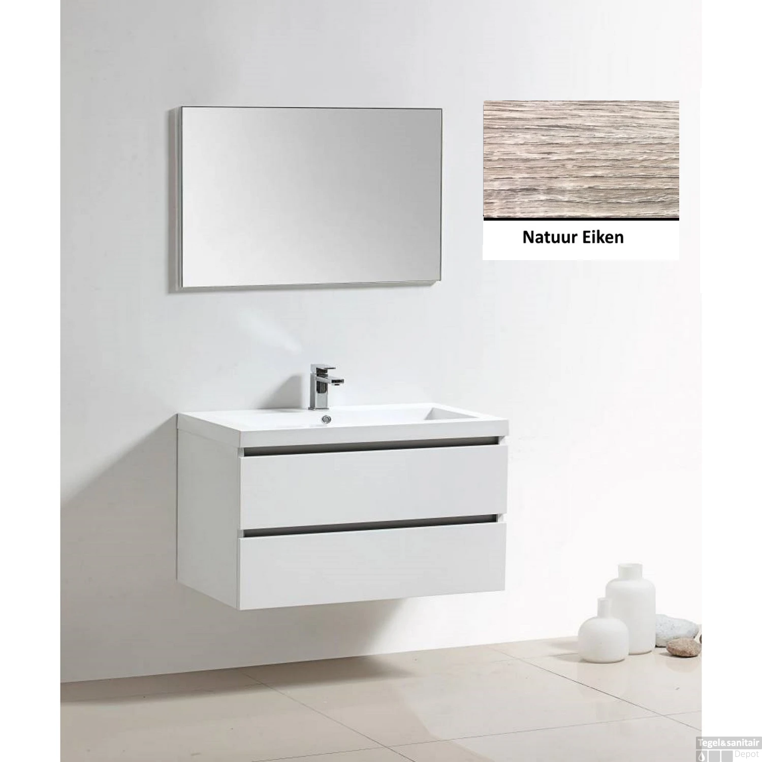 De onderkast heeft een breedte van 100 cm, een diepte van 47 cm en een hoogte van 50 cm en is afgewerkt in de kleur eiken natuur. Bij de set hoort een wastafel met een breedte van 100 cm, een diepte van 47 cm en een hoogte van 5 cm. De wastafel is gemaakt van mineraalmarmer en beschikt over een wasbak met overloop en één kraangat. Om het meubel compleet te maken kunt u kiezen uit diverse spiegels.