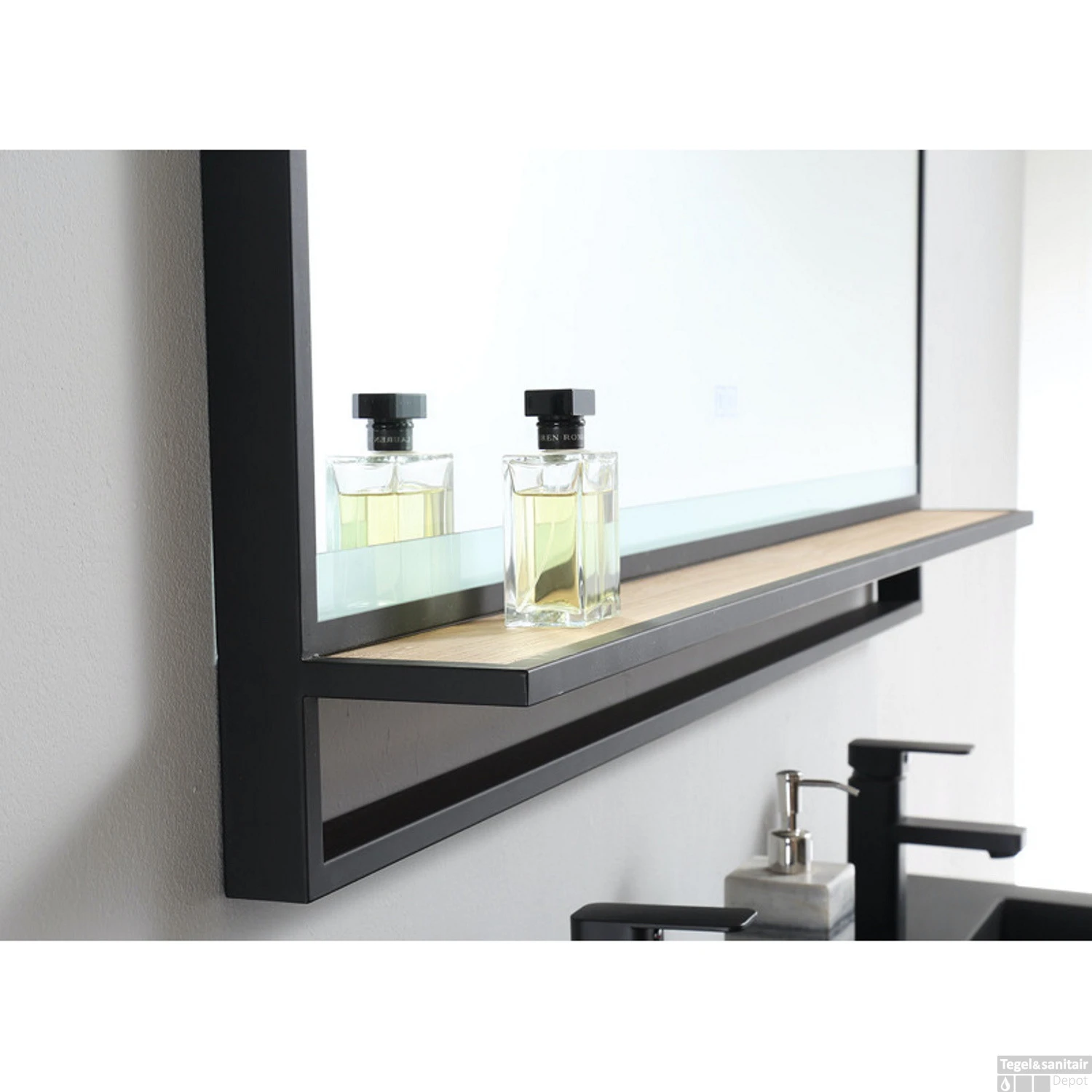 De badkamerspiegel van Casajoy past met zijn zwarte omlijsting perfect in de badkamer van nu. Overigens is de spiegel voorzien van een planchet. Hierdoor kunt u met gemak uw favoriete producten neerzetten binnen handbereik! Het zwarte profiel van de spiegel geeft samen met de eiken inleg in het planchet een stoere en industriële look aan uw badkamer.