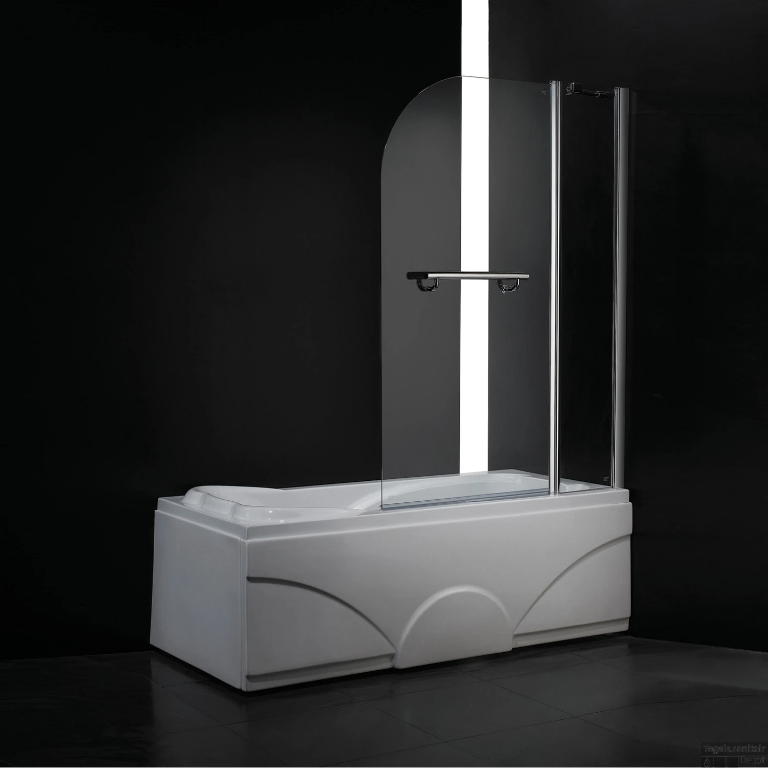De afgeronde douchewand is gemaakt van 6mm dik veiligheidsglas. Met veiligheidsglas wordt bedoelt dat op het moment dat het glas onder druk komt te staan en knapt, dat er geen scherpe scherven ontstaan. Het glas breekt namelijk direct in honderden vierkante stukjes. Het blijft natuurlijk glas, maar kleine stukjes zijn minder gevaarlijk dan scherpe scherven. Verder is de wand voorzien van een lange elegante handgreep en om het water in uw badkuip te houden zit er aan de onderkant van de badwand een strip. Dit beweegt mee zodra uw de badwand laat scharnieren. De wand is zowel naar rechts als links te scharnieren en bestaat uit een vast deel en een scharnierend deel.