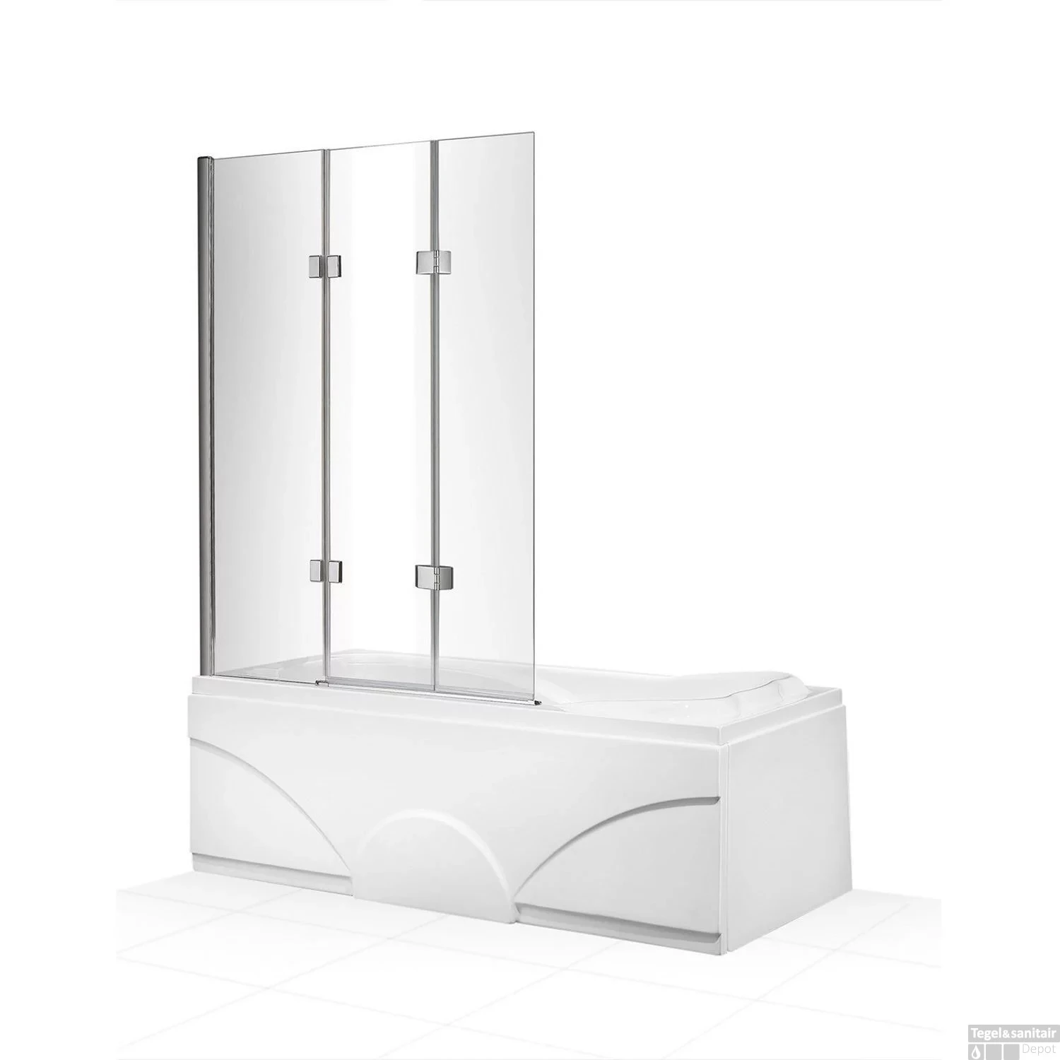 Een mooi design badwand met een dubbele scharnier deur. De badwand bestaat uit 3 delen. Vanaf het punt waar de badwand is bevestigd aan de muur, zit een 50 centimeter breed stuk glas dat vast zit aan het scharnierende deel. De deur bestaat uit twee losse scharnierende delen. U kunt de deur heel eenvoudig naar binnen als naar buiten draaien. Dat maakt het mogelijk dat de rechte badwand ook op een klein bad gemonteerd kan worden.