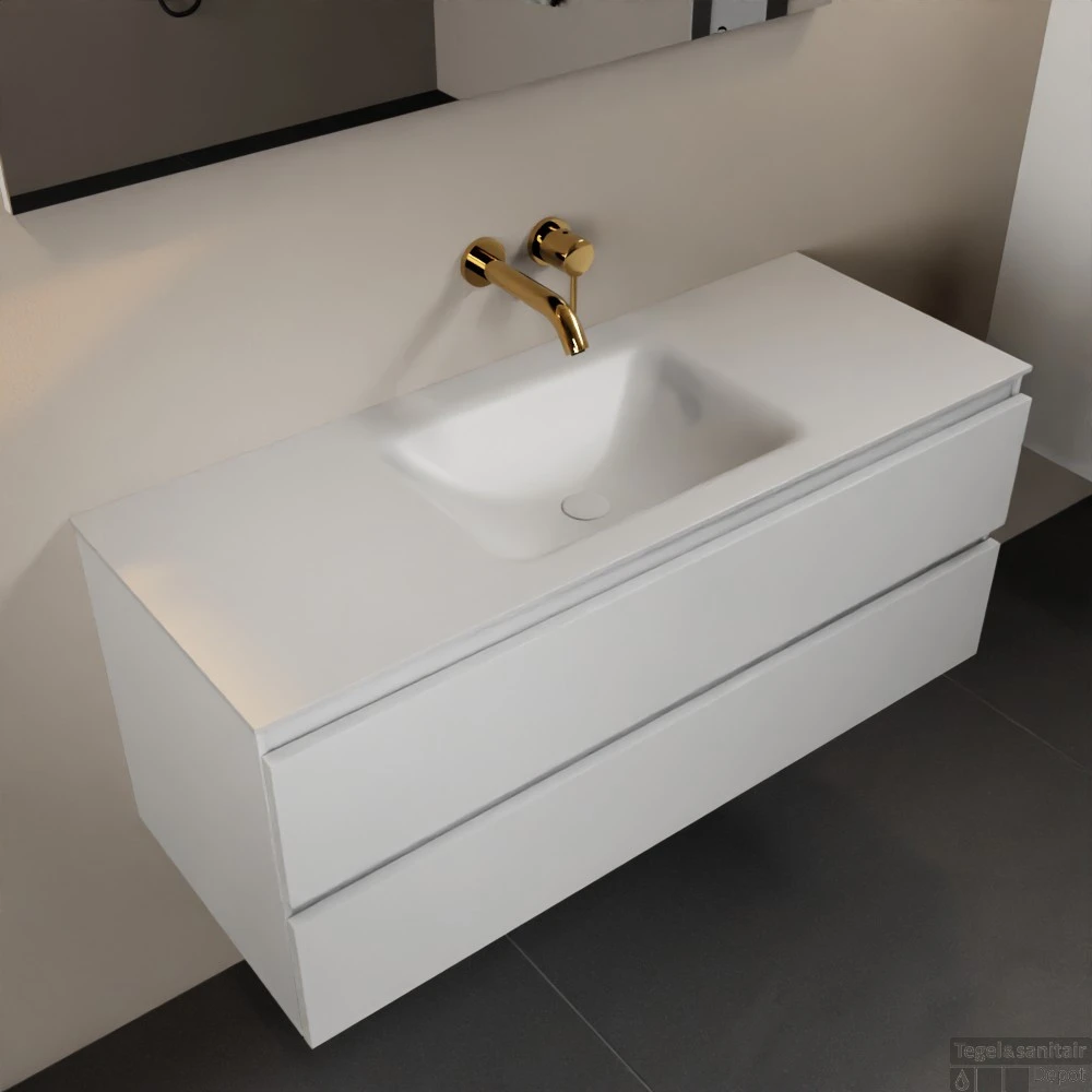 Met badkamermeubels set AIVY heeft u eindeloos veel opties om uw badkamer helemaal naar uw wensen in te vullen. En kunt u van uw badkamer een “formidabele” badkamer maken waar u heerlijk kunt genieten. U ziet hier AIVY 120cm badkamermeubel in de kleur Talc met 2 lades. De AIVY -onderkasten zijn verkrijgbaar in 4 kleuren. De 2 prachtige houttinten melamines Mocha en Chai met een voelbare houtstructuur en 2 effen gespoten kleuren MDF mat wit en matzwart. De AIVY wastafels zijn te krijgen in 2 kleuren Solid Surface, matzwart en mat wit, met de keuze wel of geen kraangaten en DENIA keramisch wit glanzende wastafel is standaard met kraangaten.