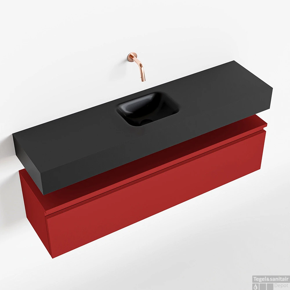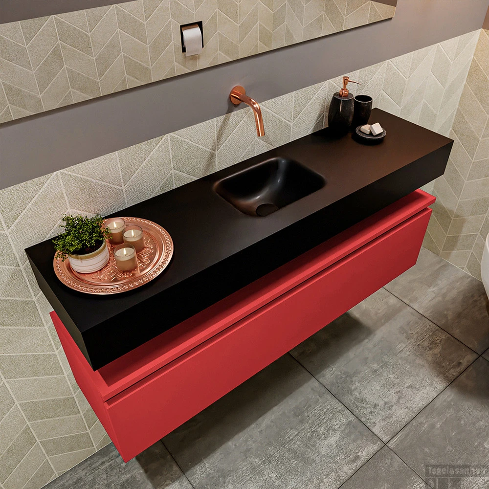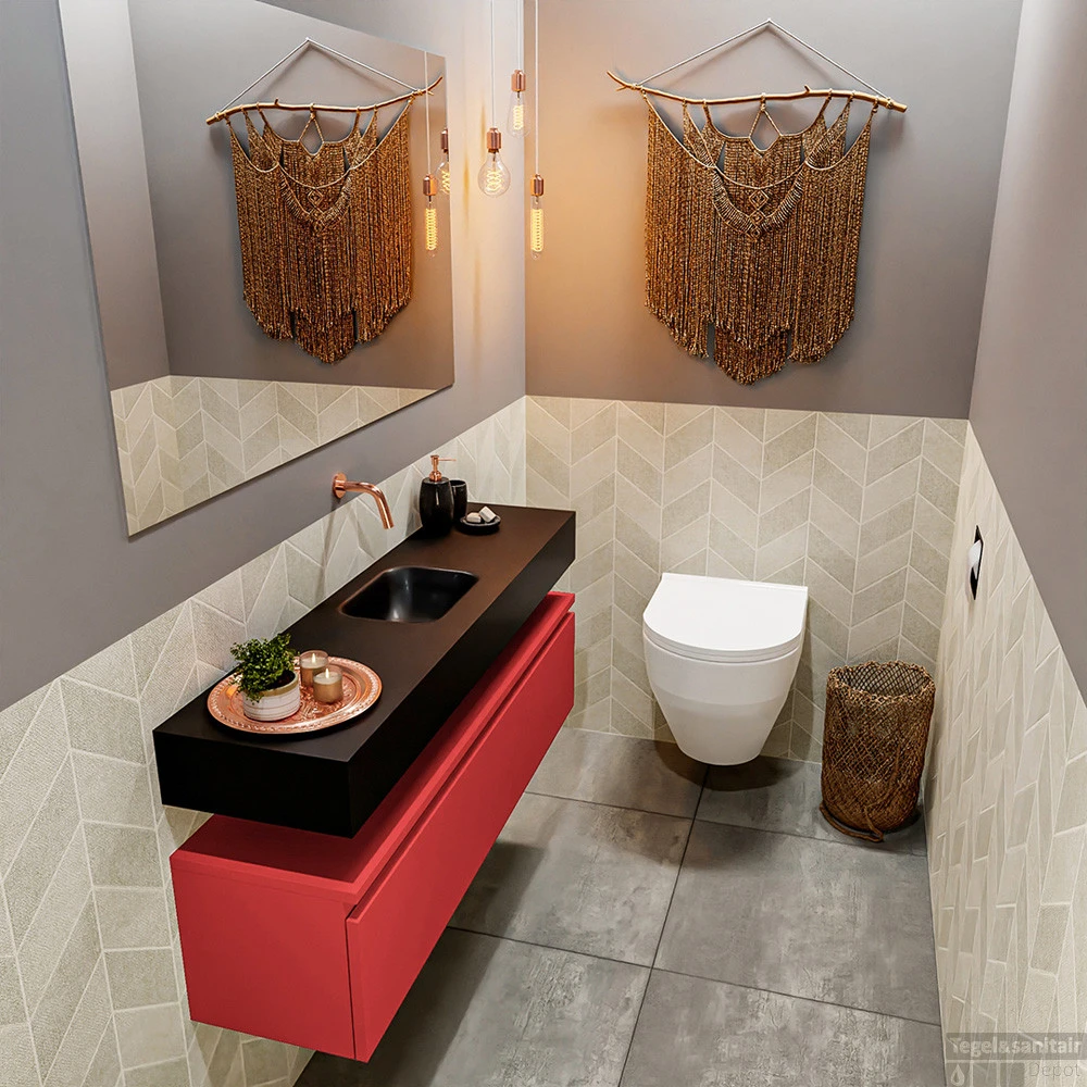 Geen ruimteverlies met deze moderne zwevende toiletmeubel ANDOR! Op de afbeelding zie je de vrijhangende wastafel LEX in 120cm breed in de kleur urban met een bijpassende badmeubel in de kleur fire. De positie van de spoelbak is midden zonder kraangat. In deze toiletmeubel serie hebben wij al meer dan 950 variaties samengesteld! Daarnaast is maatwerk mogelijk.