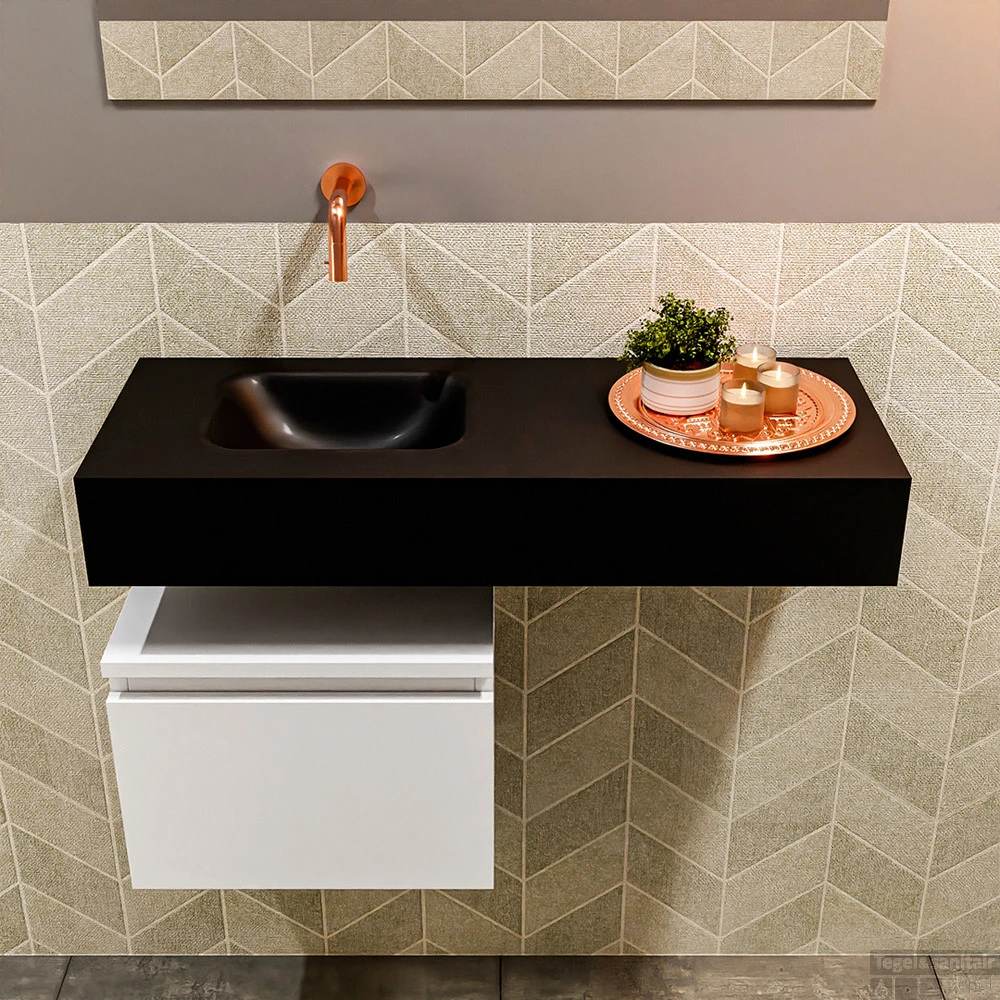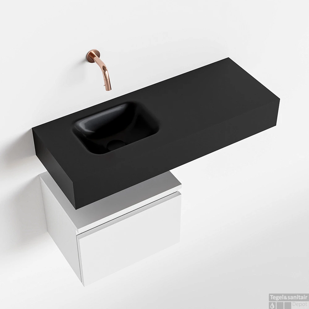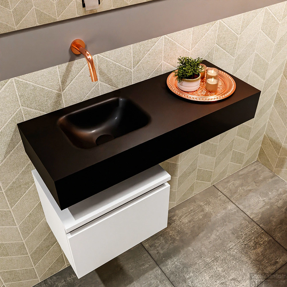 Geen ruimteverlies met deze moderne zwevende toiletmeubel ANDOR! Op de afbeelding zie je de vrijhangende wastafel LEX in 80cm breed in de kleur urban met een bijpassende badmeubel in de kleur talc. De positie van de spoelbak is links zonder kraangat. In deze toiletmeubel serie hebben wij al meer dan 950 variaties samengesteld! Daarnaast is maatwerk mogelijk.