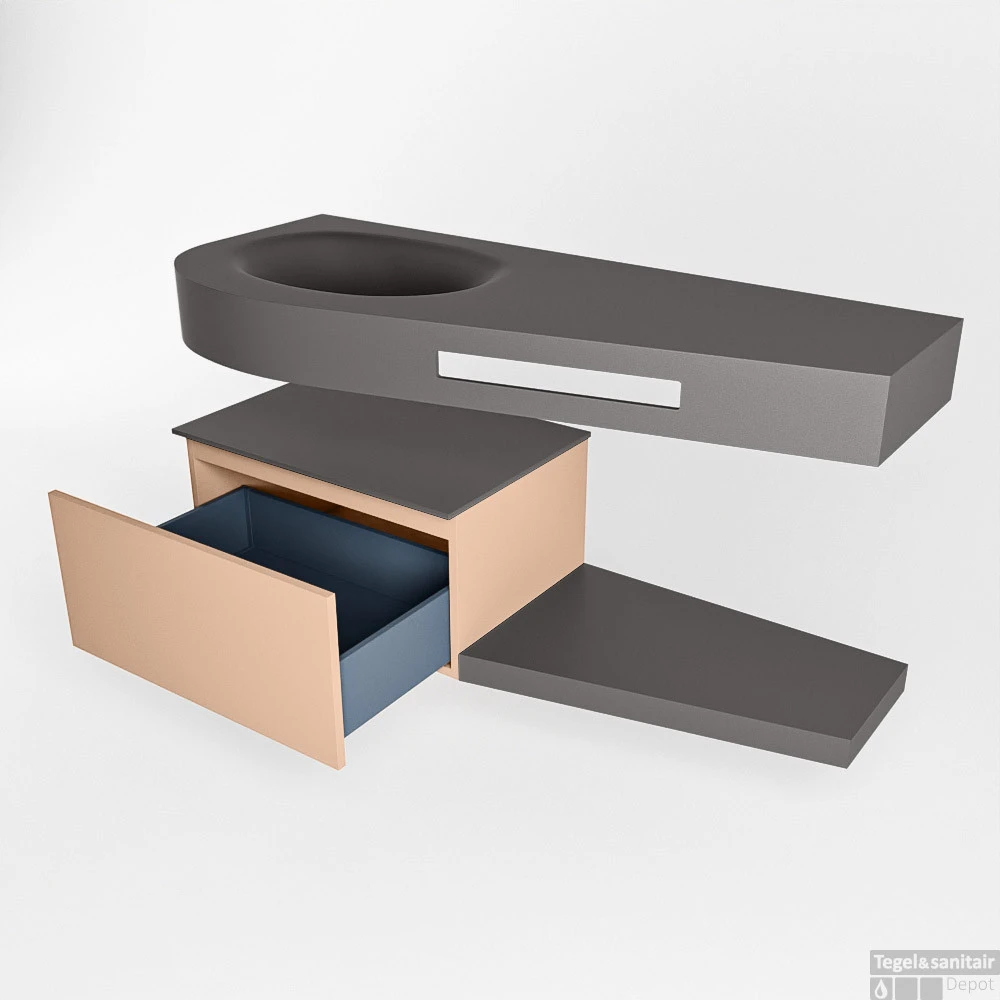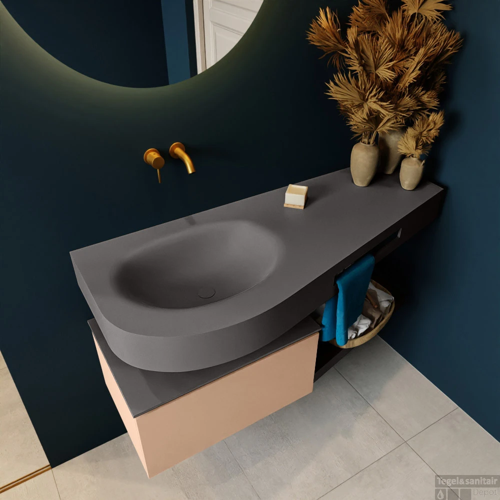 Deze set staat niet alleen mooi in een luxe hotelkamer maar kan ook een fantastische blikvanger zijn in uw badkamer. De speciale vorm van de wastafel DULCET en de geïntegreerde handdoek houder zorgen ervoor dat ook in de kleinere badkamer je kunt genieten van deze hotel chique uitstraling. De badmeubel in deze afbeeldingen is de RIVA 120cm badkamermeubel met onderkast in de kleur Rosee. De RIVA heeft een vrij hangende onderkast met 1 lade waarin voldoende ruimte is voor uw badkamer spulletjes. Het solid surface planchet heeft dezelfde toelopende vorm als de wastafel. Het planchet geeft u ruimte om mooie badkamer producten te laten zien.
