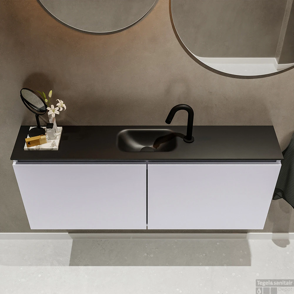 Moderniseer jouw toilet met dit toiletmeubel TURE! Het gaat hier om de vrijhangende onderkast TURE in 120cm breed met 2 deuren in de kleur cale en een solid surface wastafel model EDEN in de kleur urban. De positie van de spoelbak is midden 1 kraangat. In deze toiletmeubel serie hebben wij al meer dan 680 variaties samengesteld! Daarnaast is maatwerk mogelijk.