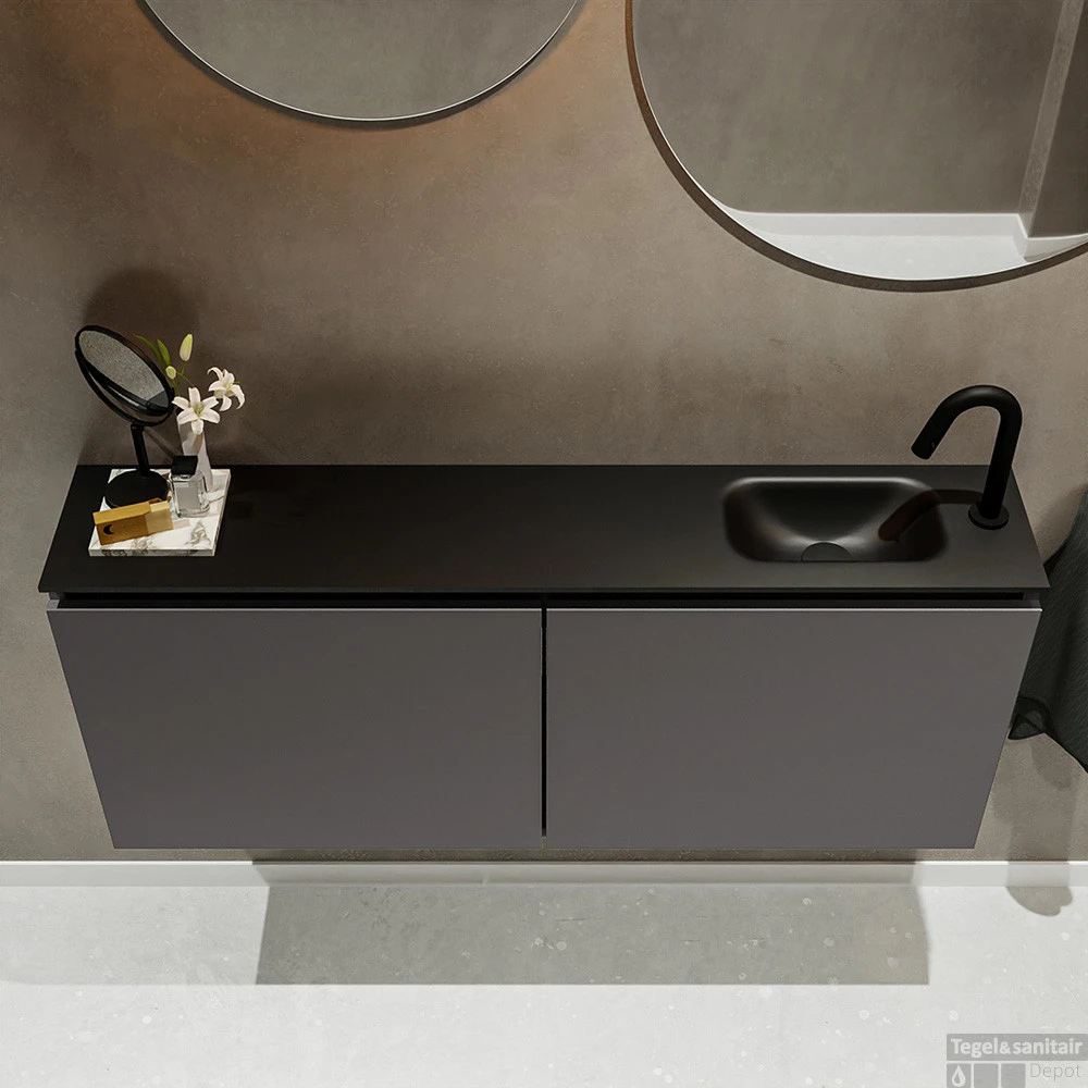 Moderniseer jouw toilet met dit toiletmeubel TURE! Het gaat hier om de vrijhangende onderkast TURE in 120cm breed met 2 deuren in de kleur dark grey en een solid surface wastafel model EDEN in de kleur urban. De positie van de spoelbak is rechts 1 kraangat. In deze toiletmeubel serie hebben wij al meer dan 680 variaties samengesteld! Daarnaast is maatwerk mogelijk.