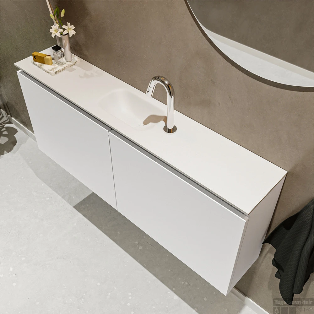 Moderniseer jouw toilet met dit toiletmeubel TURE! Het gaat hier om de vrijhangende onderkast TURE in 120cm breed met 2 deuren in de kleur talc en een solid surface wastafel model EDEN in de kleur talc. De positie van de spoelbak is midden 1 kraangat. In deze toiletmeubel serie hebben wij al meer dan 680 variaties samengesteld! Daarnaast is maatwerk mogelijk.