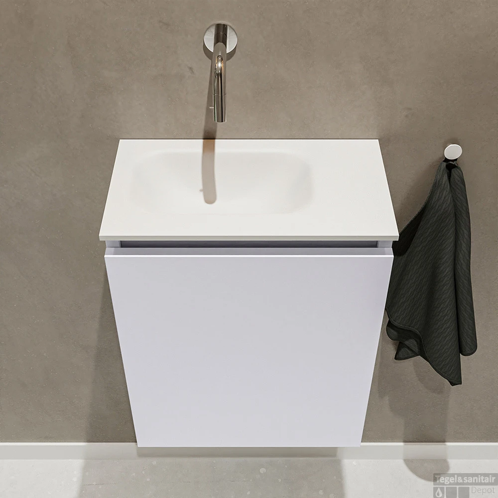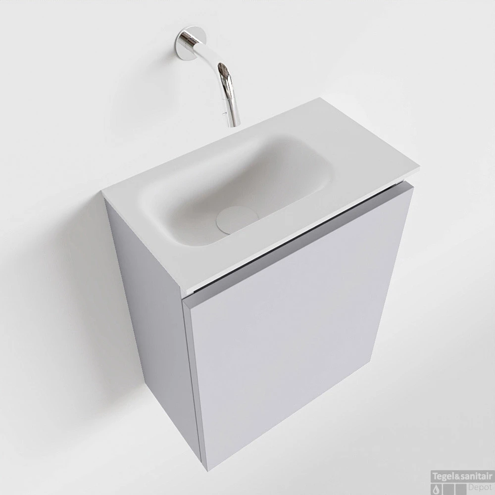 Moderniseer jouw toilet met dit toiletmeubel TURE! Het gaat hier om de vrijhangende onderkast TURE in 40cm breed met 1 deur in de kleur cale en een solid surface wastafel model EDEN in de kleur talc. De positie van de spoelbak is links zonder kraangat. In deze toiletmeubel serie hebben wij al meer dan 680 variaties samengesteld! Daarnaast is maatwerk mogelijk.