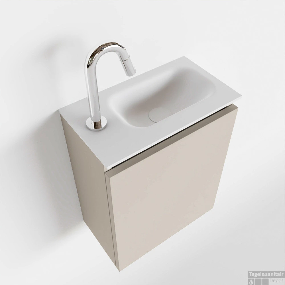 Moderniseer jouw toilet met dit toiletmeubel TURE! Het gaat hier om de vrijhangende onderkast TURE in 40cm breed met 1 deur in de kleur linen en een solid surface wastafel model EDEN in de kleur talc. De positie van de spoelbak is rechts 1 kraangat. In deze toiletmeubel serie hebben wij al meer dan 680 variaties samengesteld! Daarnaast is maatwerk mogelijk.