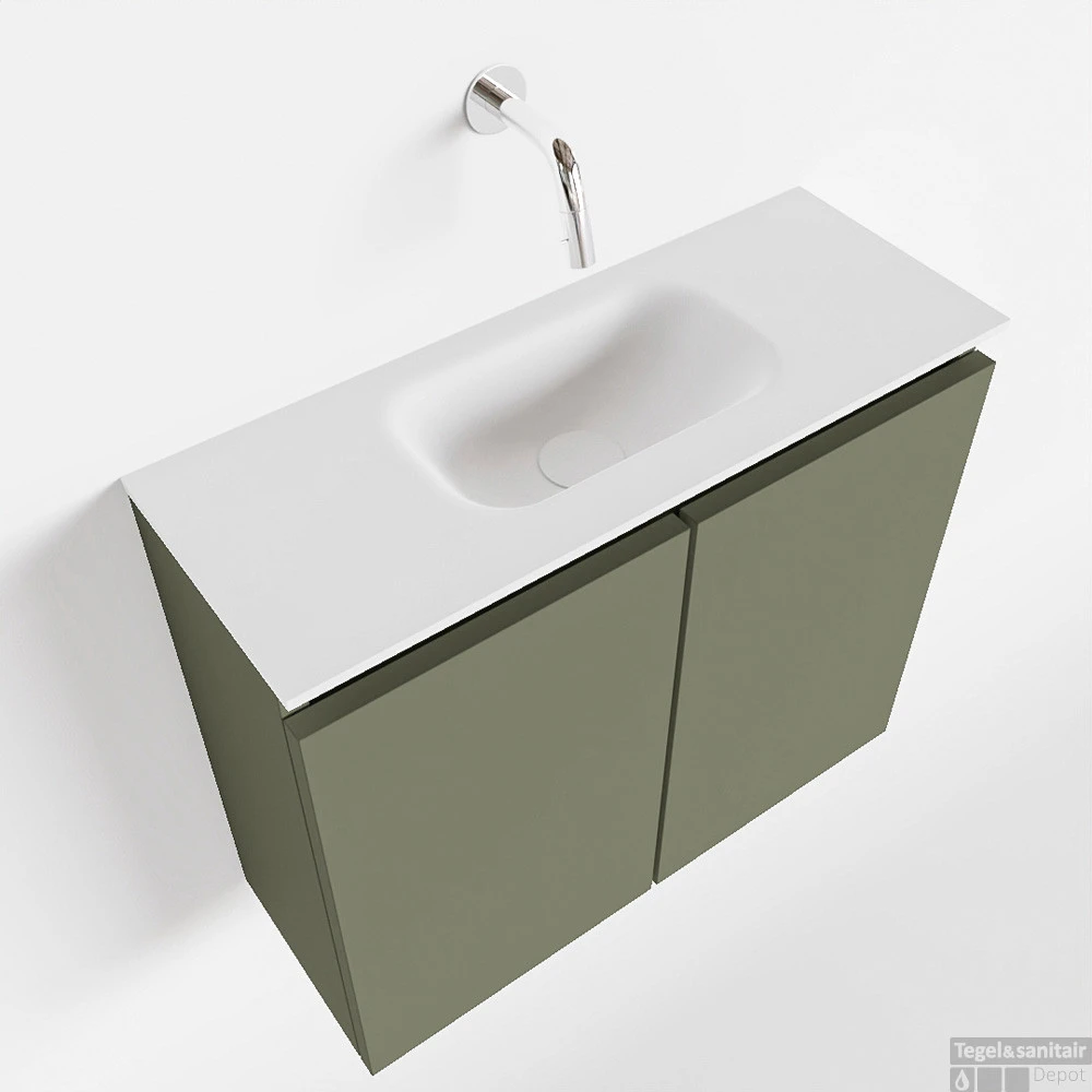 Moderniseer jouw toilet met dit toiletmeubel TURE! Het gaat hier om de vrijhangende onderkast TURE in 60cm breed met 2 deuren in de kleur army en een solid surface wastafel model EDEN in de kleur talc. De positie van de spoelbak is midden zonder kraangat. In deze toiletmeubel serie hebben wij al meer dan 680 variaties samengesteld! Daarnaast is maatwerk mogelijk.
