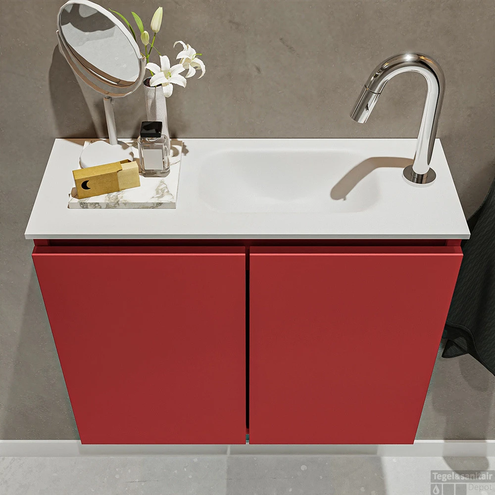 Moderniseer jouw toilet met dit toiletmeubel TURE! Het gaat hier om de vrijhangende onderkast TURE in 60cm breed met 2 deuren in de kleur fire en een solid surface wastafel model EDEN in de kleur talc. De positie van de spoelbak is rechts 1 kraangat. In deze toiletmeubel serie hebben wij al meer dan 680 variaties samengesteld! Daarnaast is maatwerk mogelijk.