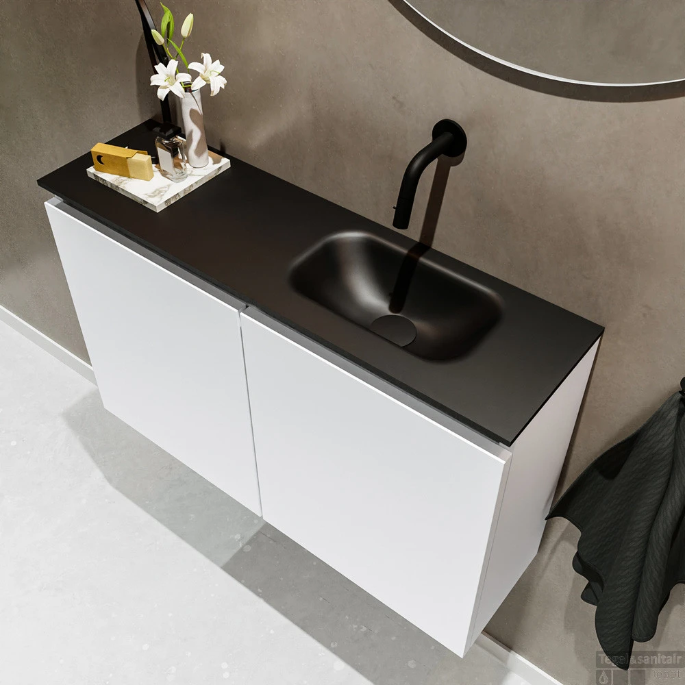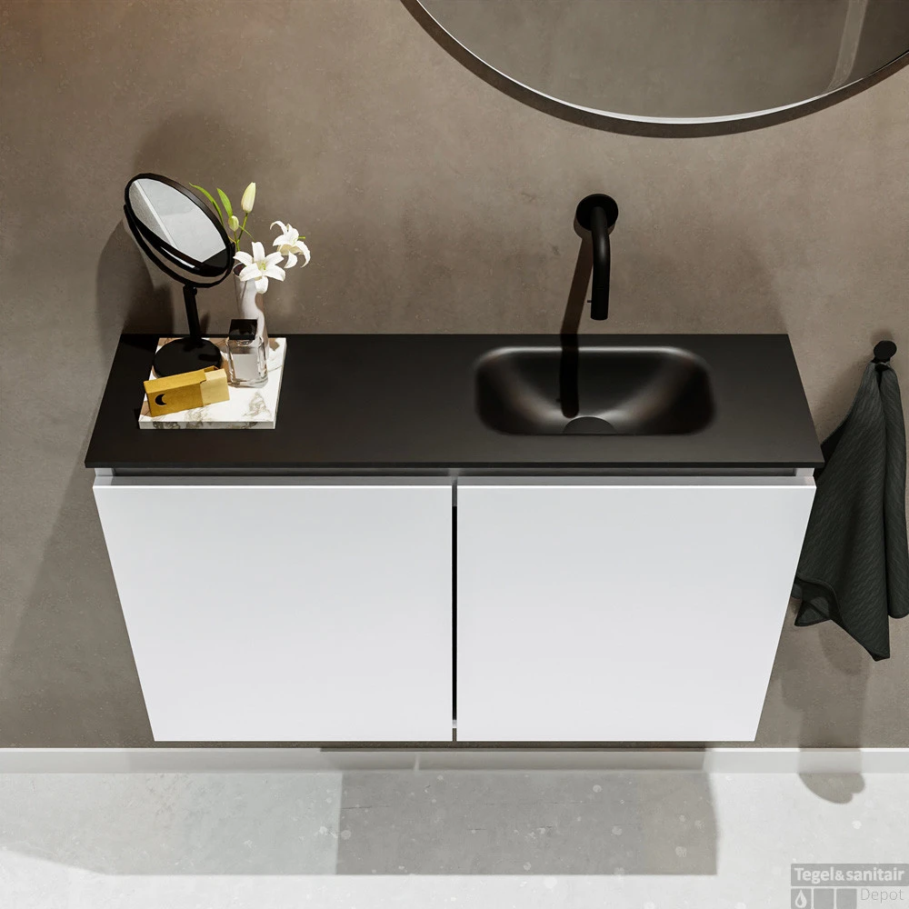 Moderniseer jouw toilet met dit toiletmeubel TURE! Het gaat hier om de vrijhangende onderkast TURE in 80cm breed met 2 deuren in de kleur talc en een solid surface wastafel model EDEN in de kleur urban. De positie van de spoelbak is rechts zonder kraangat. In deze toiletmeubel serie hebben wij al meer dan 680 variaties samengesteld! Daarnaast is maatwerk mogelijk.