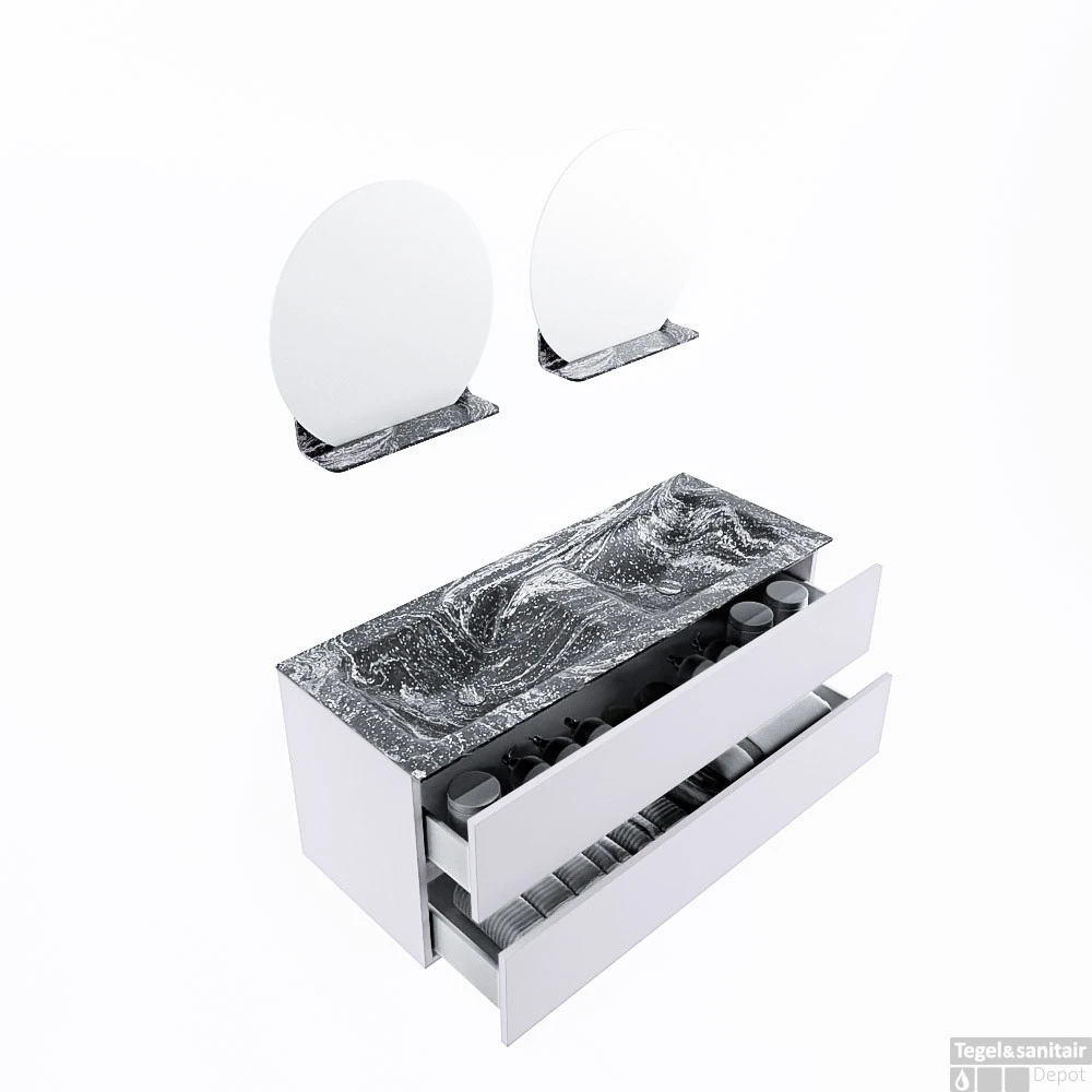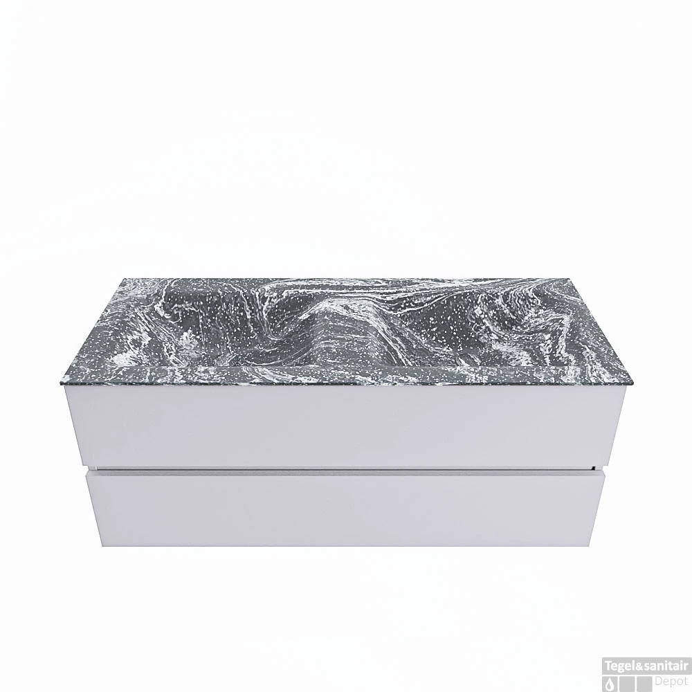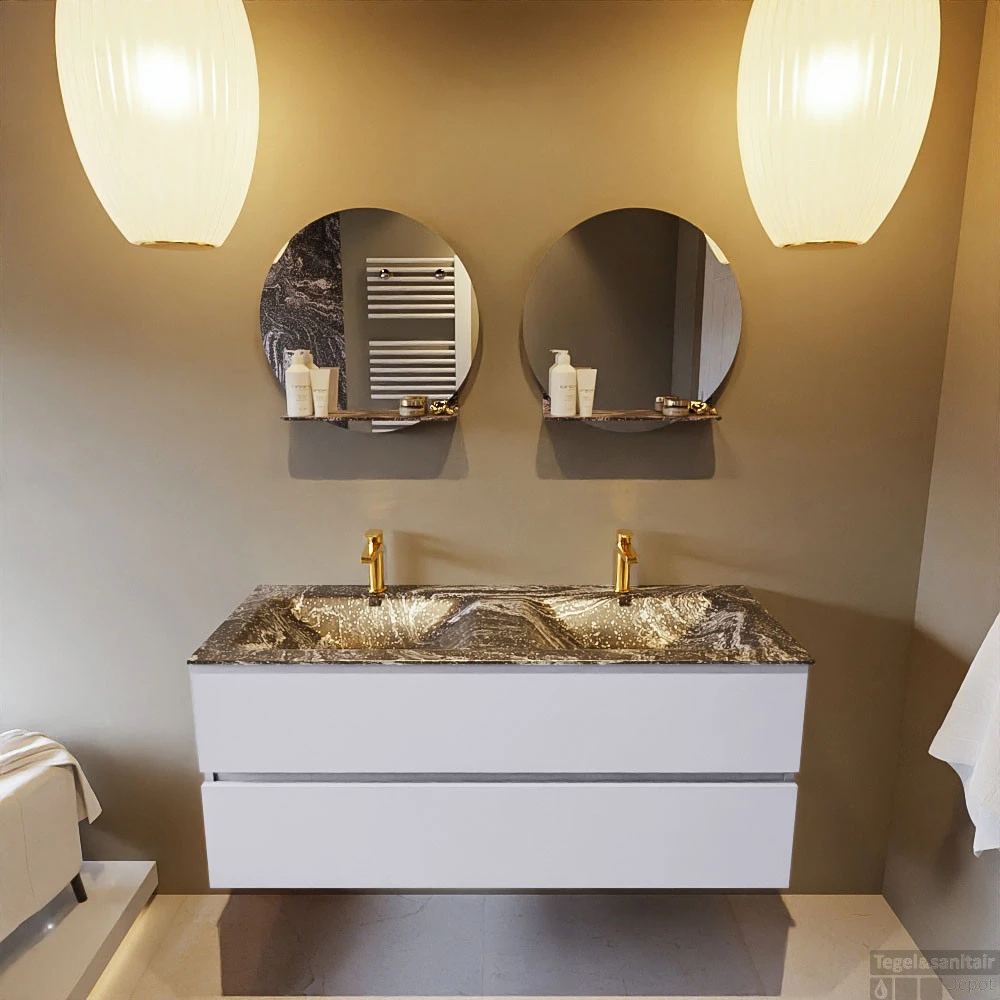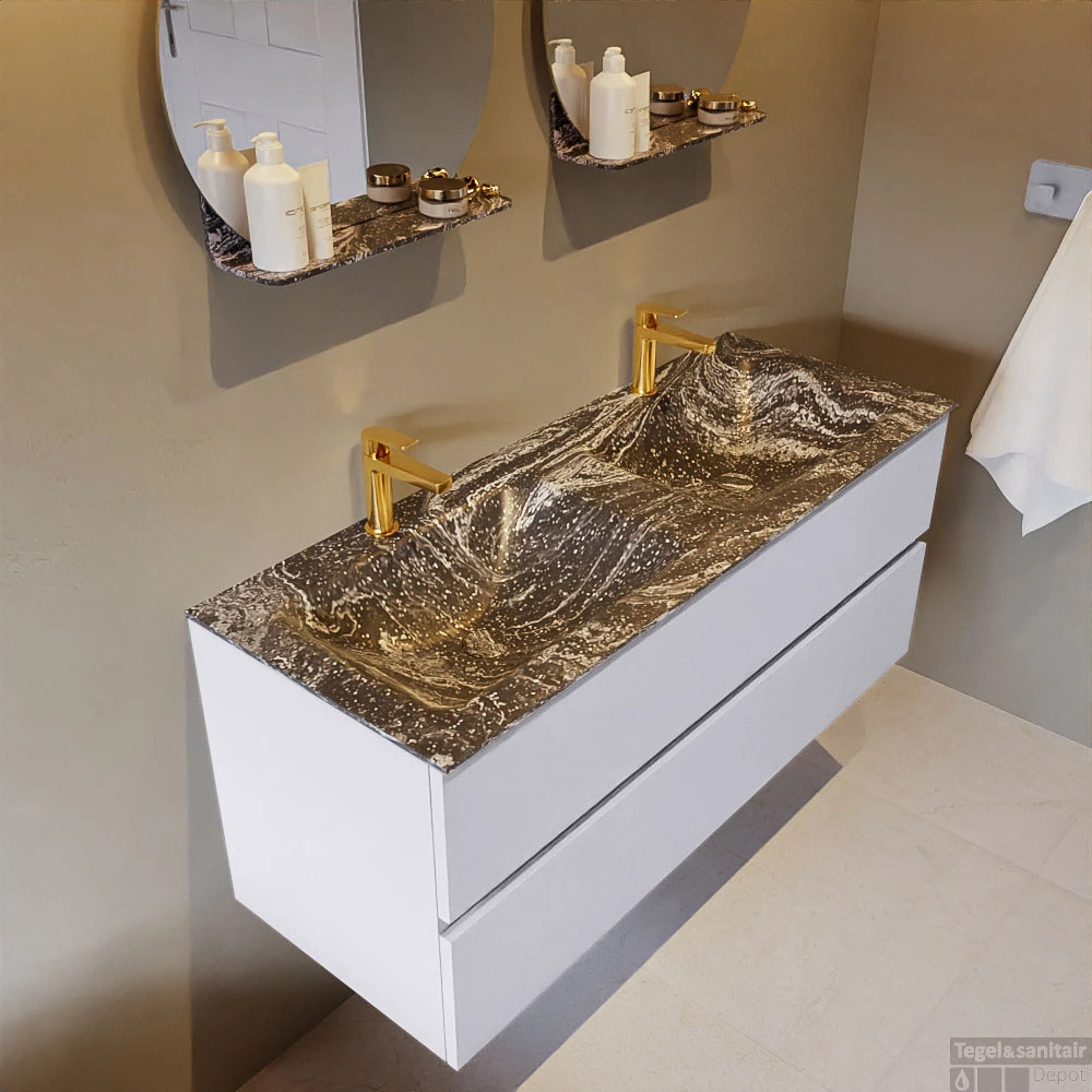 De buitengewone mooie badmeubel set VICA DLUX is een schitterend pronkstuk in uw badkamer. De gemarmerde Solid Surface wastafel van CORIAN heeft een fraaie en tijdloze uitstraling. Door de zachte en natuurlijke vorm van de wastafel, gecombineerd met de tijdloze en prachtige badmeubel onderkast past de VICA-DLUX goed bij de diverse stijlen badkamers. Om uw badkamer compleet te af te stijlen hebben wij ook de nissen en spiegelhouders in dezelfde kleur als de wastafel. Zoals de nissen en spiegel planchetten. De serie VICA DLUX bestaat uit de 2 of 4 laden onderkast VICA gecombineerd met een CORIAN Solid Surface wastafel met marmer structuur. De Solid Surface CORIAN wastafel is in 5 marmer looks verkrijgbaar. Met deze badkamermeubel set heeft u wel die mooie marmeren uitstraling maar tevens ook het gemak en de hygiëne van Solid Surface.
