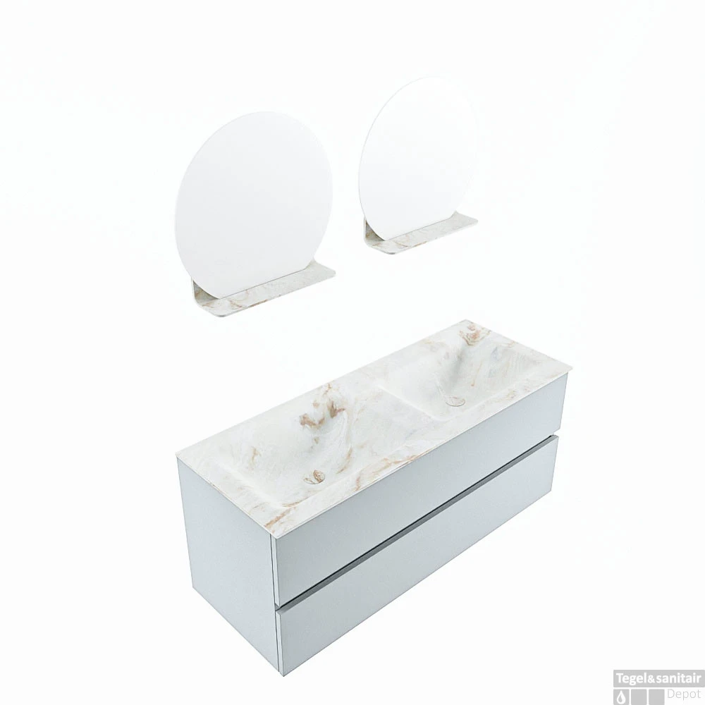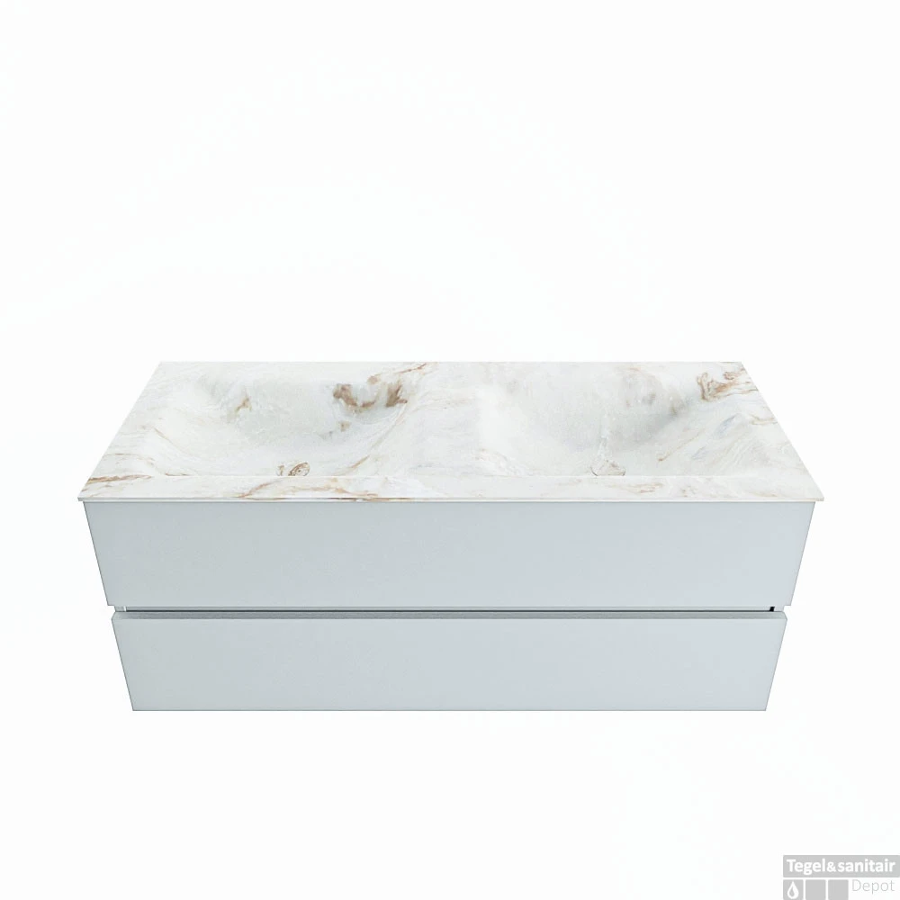 De buitengewone mooie badmeubel set VICA DLUX is een schitterend pronkstuk in uw badkamer. De gemarmerde Solid Surface wastafel van CORIAN heeft een fraaie en tijdloze uitstraling. Door de zachte en natuurlijke vorm van de wastafel, gecombineerd met de tijdloze en prachtige badmeubel onderkast past de VICA-DLUX goed bij de diverse stijlen badkamers. Om uw badkamer compleet te af te stijlen hebben wij ook de nissen en spiegelhouders in dezelfde kleur als de wastafel. Zoals de nissen en spiegel planchetten. De serie VICA DLUX bestaat uit de 2 of 4 laden onderkast VICA gecombineerd met een CORIAN Solid Surface wastafel met marmer structuur. De Solid Surface CORIAN wastafel is in 5 marmer looks verkrijgbaar. Met deze badkamermeubel set heeft u wel die mooie marmeren uitstraling maar tevens ook het gemak en de hygiëne van Solid Surface.