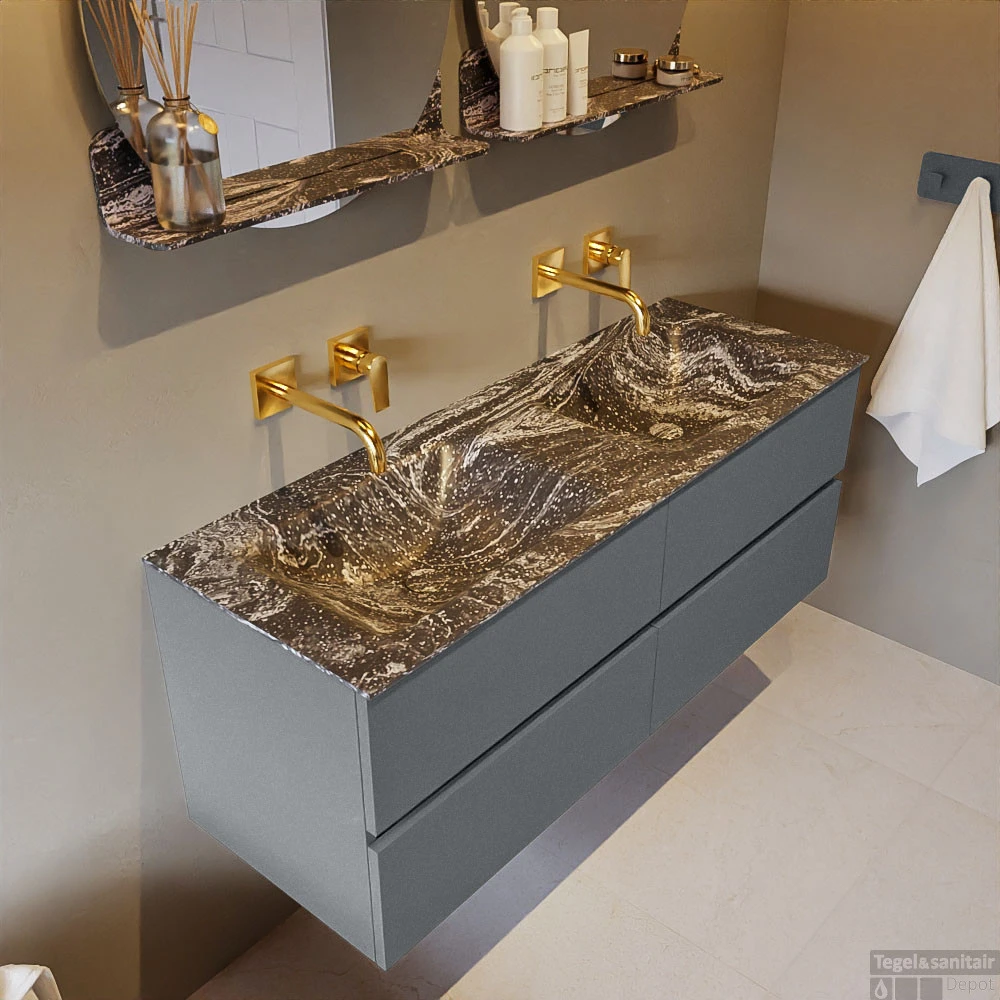 De buitengewone mooie badmeubel set VICA DLUX is een schitterend pronkstuk in uw badkamer. De gemarmerde Solid Surface wastafel van CORIAN heeft een fraaie en tijdloze uitstraling. Door de zachte en natuurlijke vorm van de wastafel, gecombineerd met de tijdloze en prachtige badmeubel onderkast past de VICA-DLUX goed bij de diverse stijlen badkamers. Om uw badkamer compleet te af te stijlen hebben wij ook de nissen en spiegelhouders in dezelfde kleur als de wastafel. Zoals de nissen en spiegel planchetten. De serie VICA DLUX bestaat uit de 2 of 4 laden onderkast VICA gecombineerd met een CORIAN Solid Surface wastafel met marmer structuur. De Solid Surface CORIAN wastafel is in 5 marmer looks verkrijgbaar. Met deze badkamermeubel set heeft u wel die mooie marmeren uitstraling maar tevens ook het gemak en de hygiëne van Solid Surface.