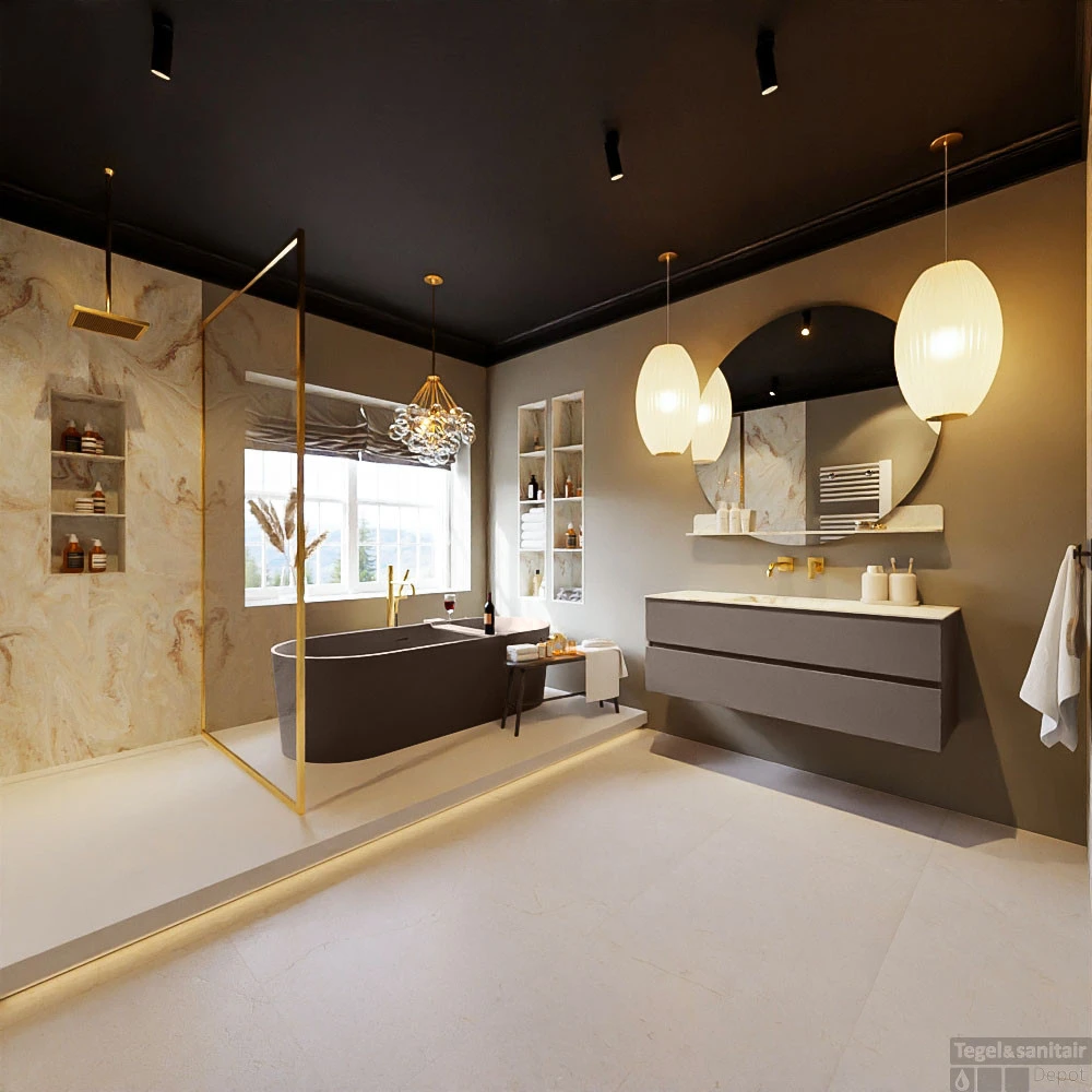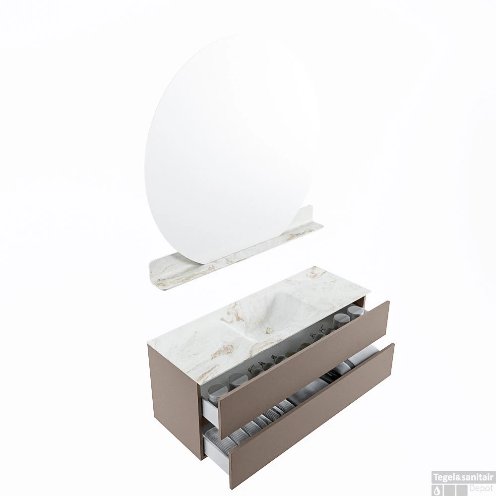 De buitengewone mooie badmeubel set VICA DLUX is een schitterend pronkstuk in uw badkamer. De gemarmerde Solid Surface wastafel van CORIAN heeft een fraaie en tijdloze uitstraling. Door de zachte en natuurlijke vorm van de wastafel, gecombineerd met de tijdloze en prachtige badmeubel onderkast past de VICA-DLUX goed bij de diverse stijlen badkamers. Om uw badkamer compleet te af te stijlen hebben wij ook de nissen en spiegelhouders in dezelfde kleur als de wastafel. Zoals de nissen en spiegel planchetten. De serie VICA DLUX bestaat uit de 2 of 4 laden onderkast VICA gecombineerd met een CORIAN Solid Surface wastafel met marmer structuur. De Solid Surface CORIAN wastafel is in 5 marmer looks verkrijgbaar. Met deze badkamermeubel set heeft u wel die mooie marmeren uitstraling maar tevens ook het gemak en de hygiëne van Solid Surface.