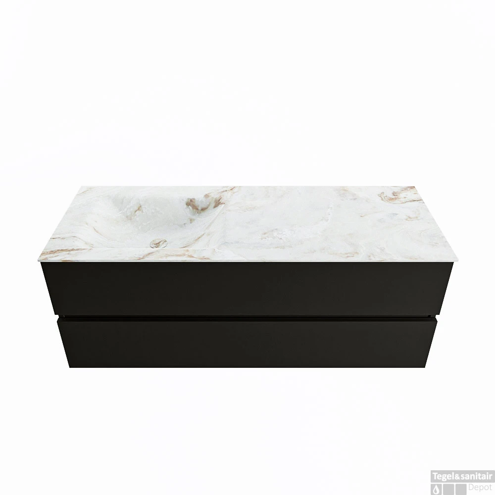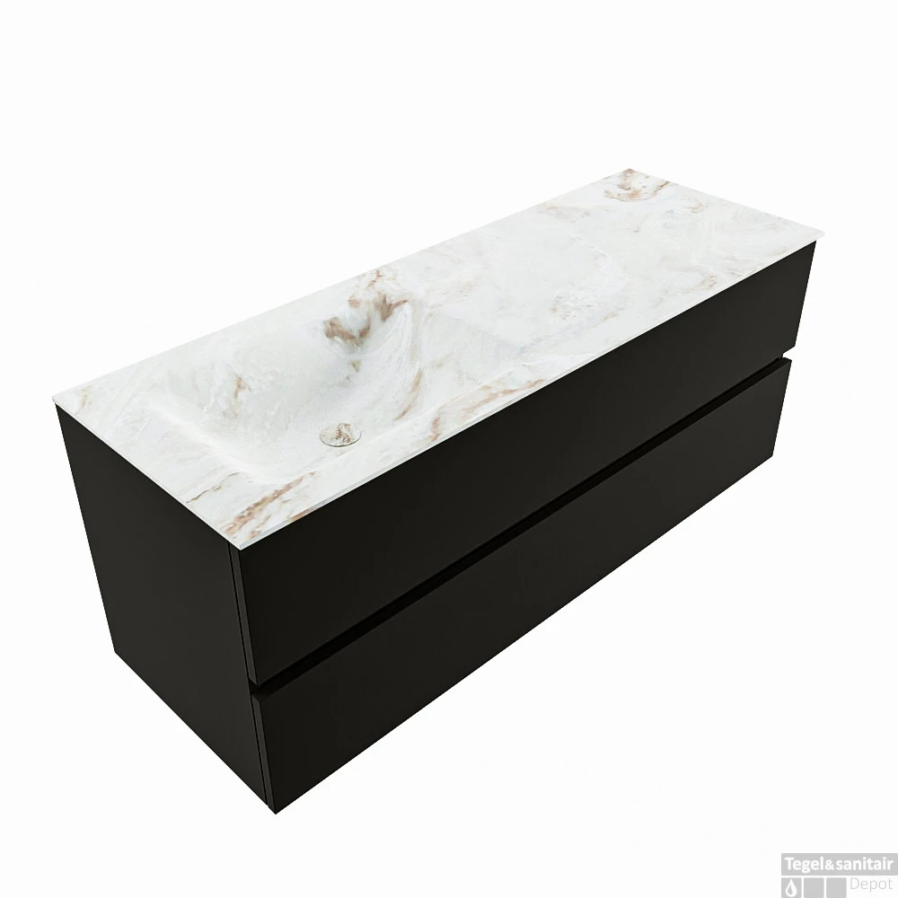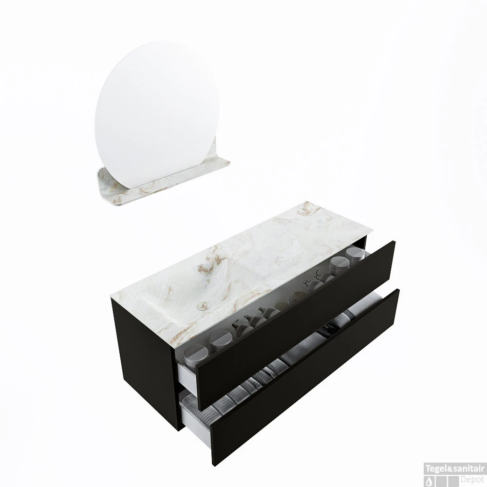 De buitengewone mooie badmeubel set VICA DLUX is een schitterend pronkstuk in uw badkamer. De gemarmerde Solid Surface wastafel van CORIAN heeft een fraaie en tijdloze uitstraling. Door de zachte en natuurlijke vorm van de wastafel, gecombineerd met de tijdloze en prachtige badmeubel onderkast past de VICA-DLUX goed bij de diverse stijlen badkamers. Om uw badkamer compleet te af te stijlen hebben wij ook de nissen en spiegelhouders in dezelfde kleur als de wastafel. Zoals de nissen en spiegel planchetten. De serie VICA DLUX bestaat uit de 2 of 4 laden onderkast VICA gecombineerd met een CORIAN Solid Surface wastafel met marmer structuur. De Solid Surface CORIAN wastafel is in 5 marmer looks verkrijgbaar. Met deze badkamermeubel set heeft u wel die mooie marmeren uitstraling maar tevens ook het gemak en de hygiëne van Solid Surface.