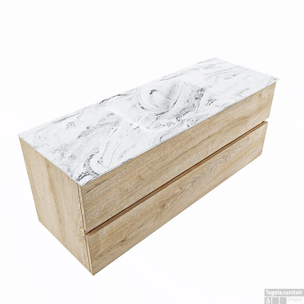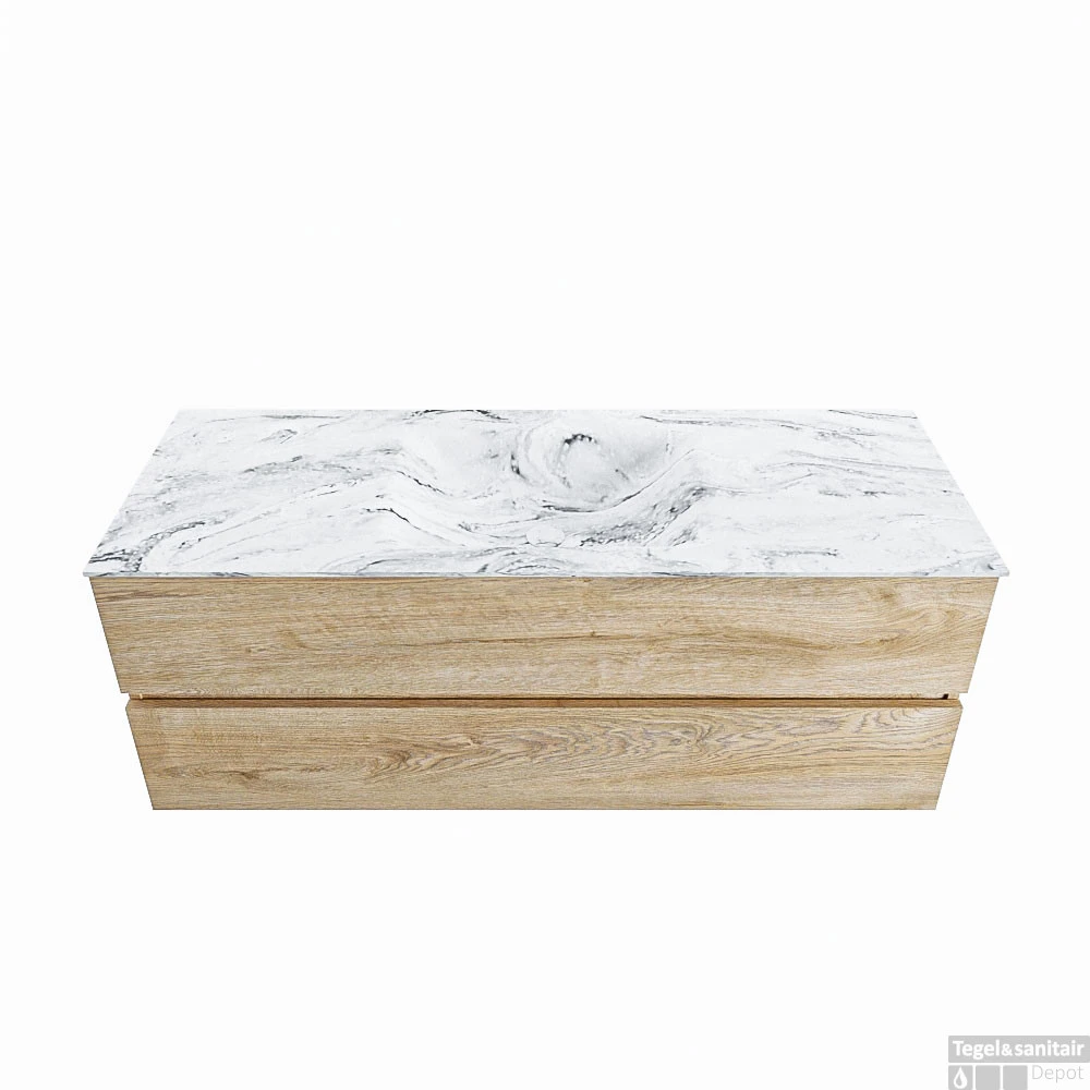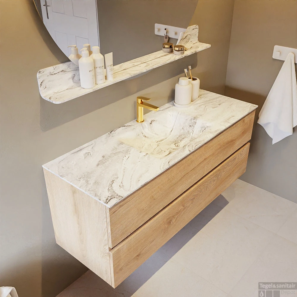 De buitengewone mooie badmeubel set VICA DLUX is een schitterend pronkstuk in uw badkamer. De gemarmerde Solid Surface wastafel van CORIAN heeft een fraaie en tijdloze uitstraling. Door de zachte en natuurlijke vorm van de wastafel, gecombineerd met de tijdloze en prachtige badmeubel onderkast past de VICA-DLUX goed bij de diverse stijlen badkamers. Om uw badkamer compleet te af te stijlen hebben wij ook de nissen en spiegelhouders in dezelfde kleur als de wastafel. Zoals de nissen en spiegel planchetten. De serie VICA DLUX bestaat uit de 2 of 4 laden onderkast VICA gecombineerd met een CORIAN Solid Surface wastafel met marmer structuur. De Solid Surface CORIAN wastafel is in 5 marmer looks verkrijgbaar. Met deze badkamermeubel set heeft u wel die mooie marmeren uitstraling maar tevens ook het gemak en de hygiëne van Solid Surface.