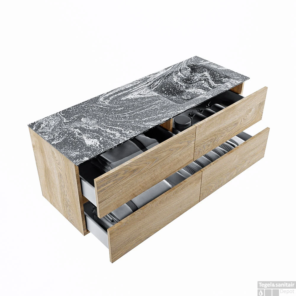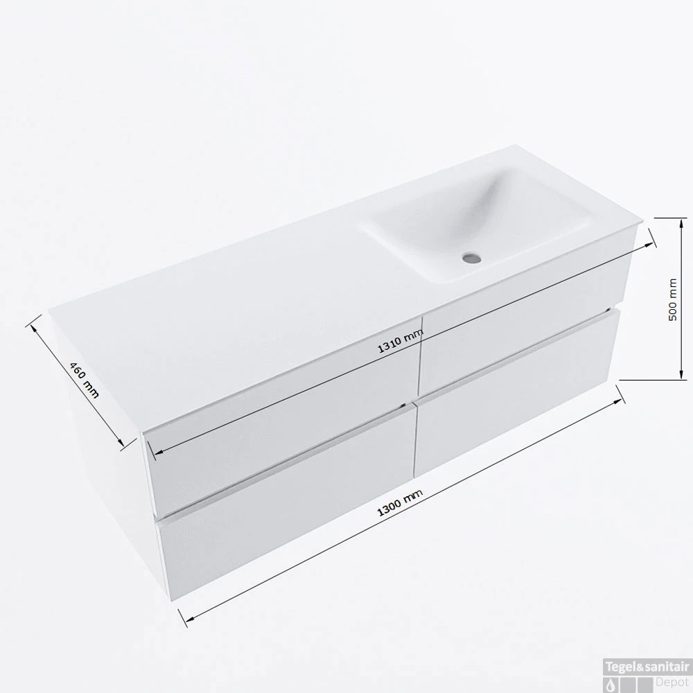 De buitengewone mooie badmeubel set VICA DLUX is een schitterend pronkstuk in uw badkamer. De gemarmerde Solid Surface wastafel van CORIAN heeft een fraaie en tijdloze uitstraling. Door de zachte en natuurlijke vorm van de wastafel, gecombineerd met de tijdloze en prachtige badmeubel onderkast past de VICA-DLUX goed bij de diverse stijlen badkamers. Om uw badkamer compleet te af te stijlen hebben wij ook de nissen en spiegelhouders in dezelfde kleur als de wastafel. Zoals de nissen en spiegel planchetten. De serie VICA DLUX bestaat uit de 2 of 4 laden onderkast VICA gecombineerd met een CORIAN Solid Surface wastafel met marmer structuur. De Solid Surface CORIAN wastafel is in 5 marmer looks verkrijgbaar. Met deze badkamermeubel set heeft u wel die mooie marmeren uitstraling maar tevens ook het gemak en de hygiëne van Solid Surface.