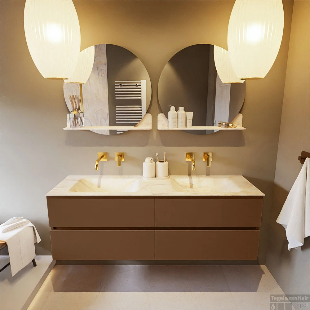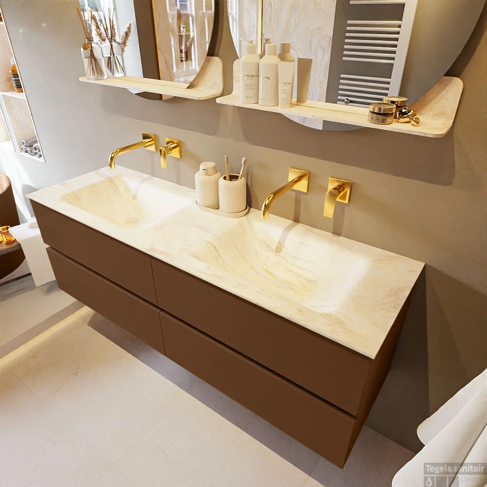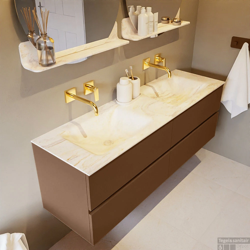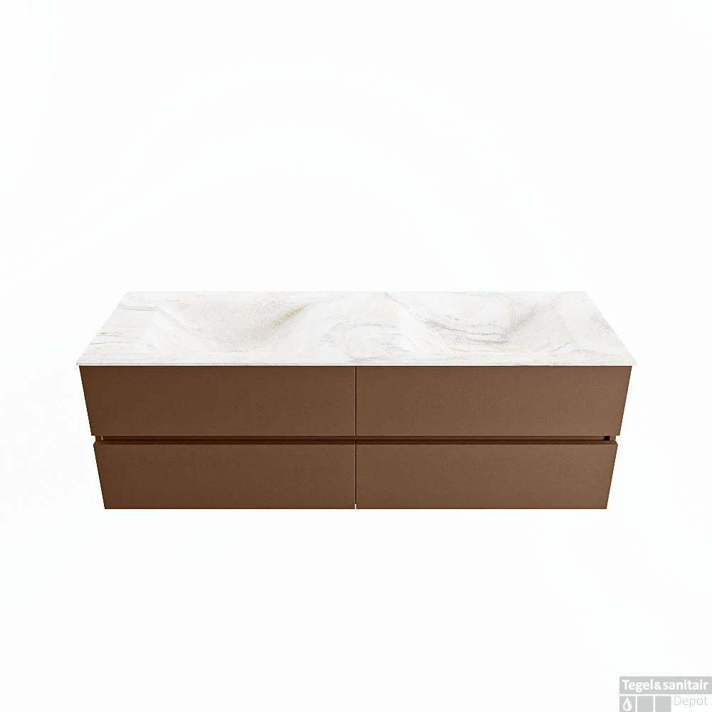De buitengewone mooie badmeubel set VICA DLUX is een schitterend pronkstuk in uw badkamer. De gemarmerde Solid Surface wastafel van CORIAN heeft een fraaie en tijdloze uitstraling. Door de zachte en natuurlijke vorm van de wastafel, gecombineerd met de tijdloze en prachtige badmeubel onderkast past de VICA-DLUX goed bij de diverse stijlen badkamers. Om uw badkamer compleet te af te stijlen hebben wij ook de nissen en spiegelhouders in dezelfde kleur als de wastafel. Zoals de nissen en spiegel planchetten. De serie VICA DLUX bestaat uit de 2 of 4 laden onderkast VICA gecombineerd met een CORIAN Solid Surface wastafel met marmer structuur. De Solid Surface CORIAN wastafel is in 5 marmer looks verkrijgbaar. Met deze badkamermeubel set heeft u wel die mooie marmeren uitstraling maar tevens ook het gemak en de hygiëne van Solid Surface.