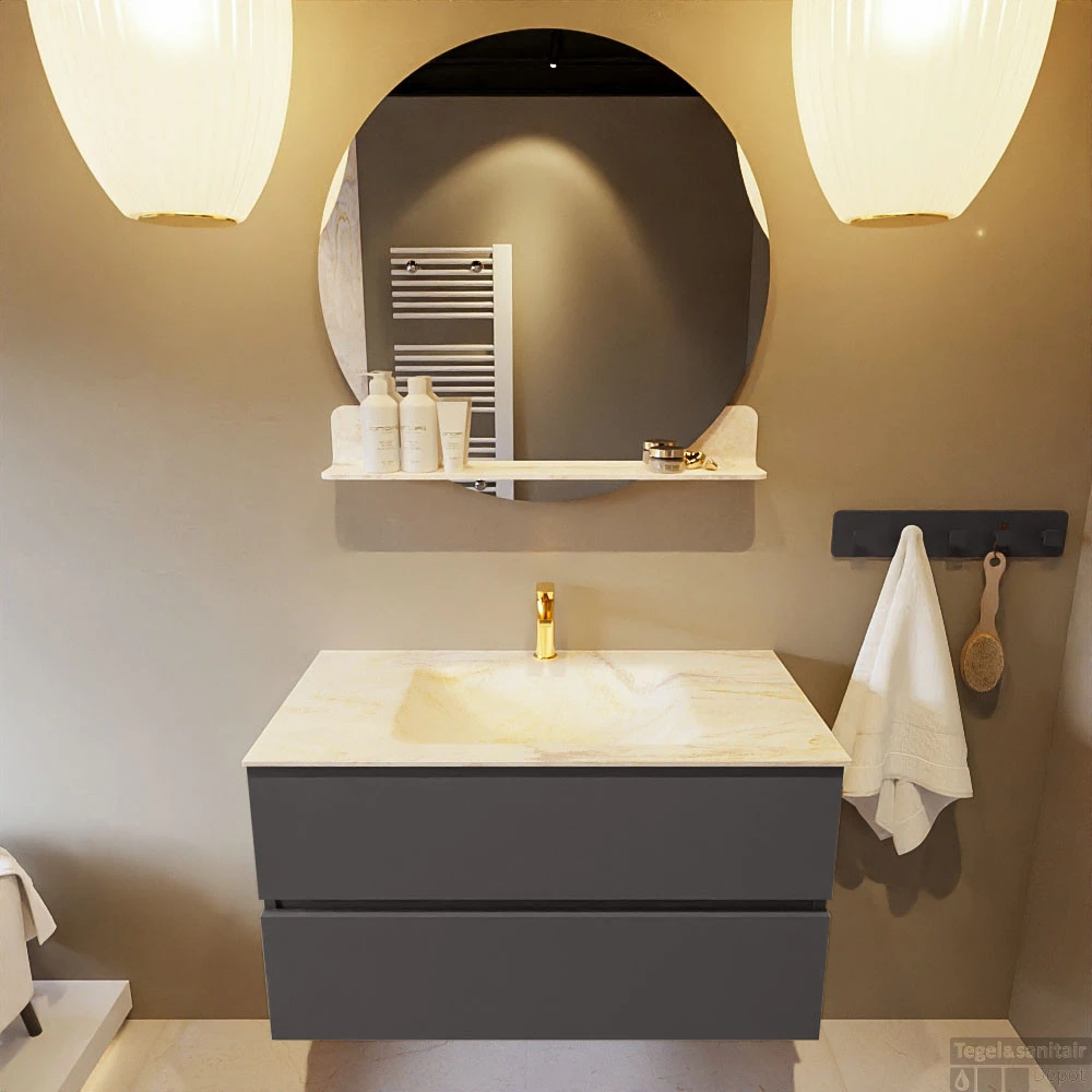 De buitengewone mooie badmeubel set VICA DLUX is een schitterend pronkstuk in uw badkamer. De gemarmerde Solid Surface wastafel van CORIAN heeft een fraaie en tijdloze uitstraling. Door de zachte en natuurlijke vorm van de wastafel, gecombineerd met de tijdloze en prachtige badmeubel onderkast past de VICA-DLUX goed bij de diverse stijlen badkamers. Om uw badkamer compleet te af te stijlen hebben wij ook de nissen en spiegelhouders in dezelfde kleur als de wastafel. Zoals de nissen en spiegel planchetten. De serie VICA DLUX bestaat uit de 2 of 4 laden onderkast VICA gecombineerd met een CORIAN Solid Surface wastafel met marmer structuur. De Solid Surface CORIAN wastafel is in 5 marmer looks verkrijgbaar. Met deze badkamermeubel set heeft u wel die mooie marmeren uitstraling maar tevens ook het gemak en de hygiëne van Solid Surface.