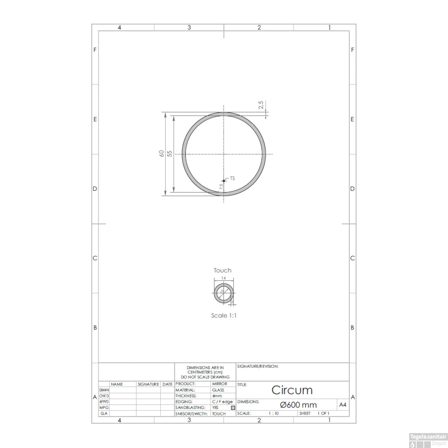 De spiegel heeft een diameter van 60 cm en een glasdikte van 4 mm, ook is de spiegel voorzien van geïntegreerde spiegelverwarming. Verder bevat de spiegel een touch knop waarmee u de verlichting eenvoudig kunt bedienen.