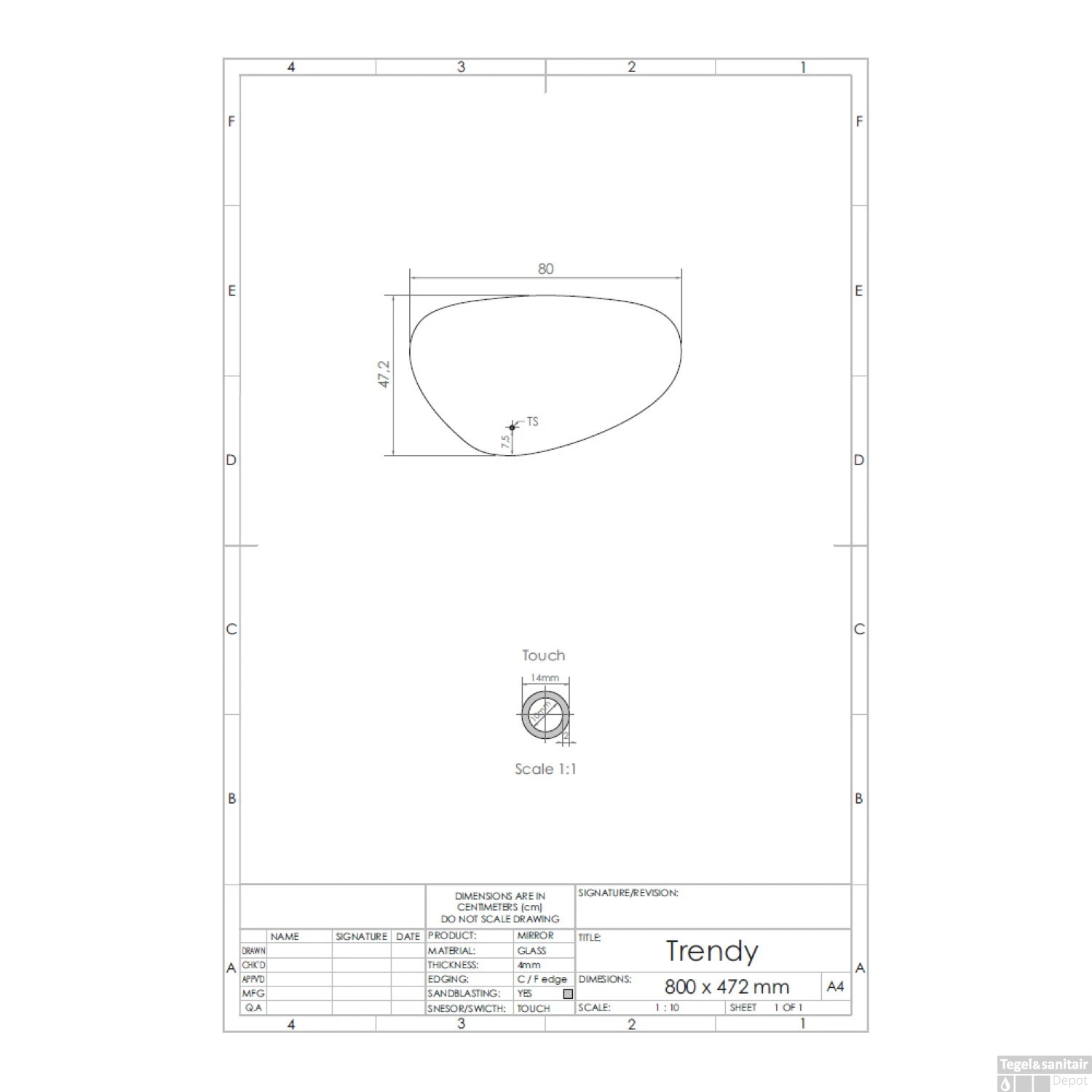 De spiegel is 80 cm breed, heeft een hoogte van 47.2 cm en een glasdikte van 4 mm. Verder bevat de spiegel een touch knop waarmee u de verlichting eenvoudig kunt bedienen en is de spiegel voorzien van een knop voor geïntegreerde spiegelverwarming.