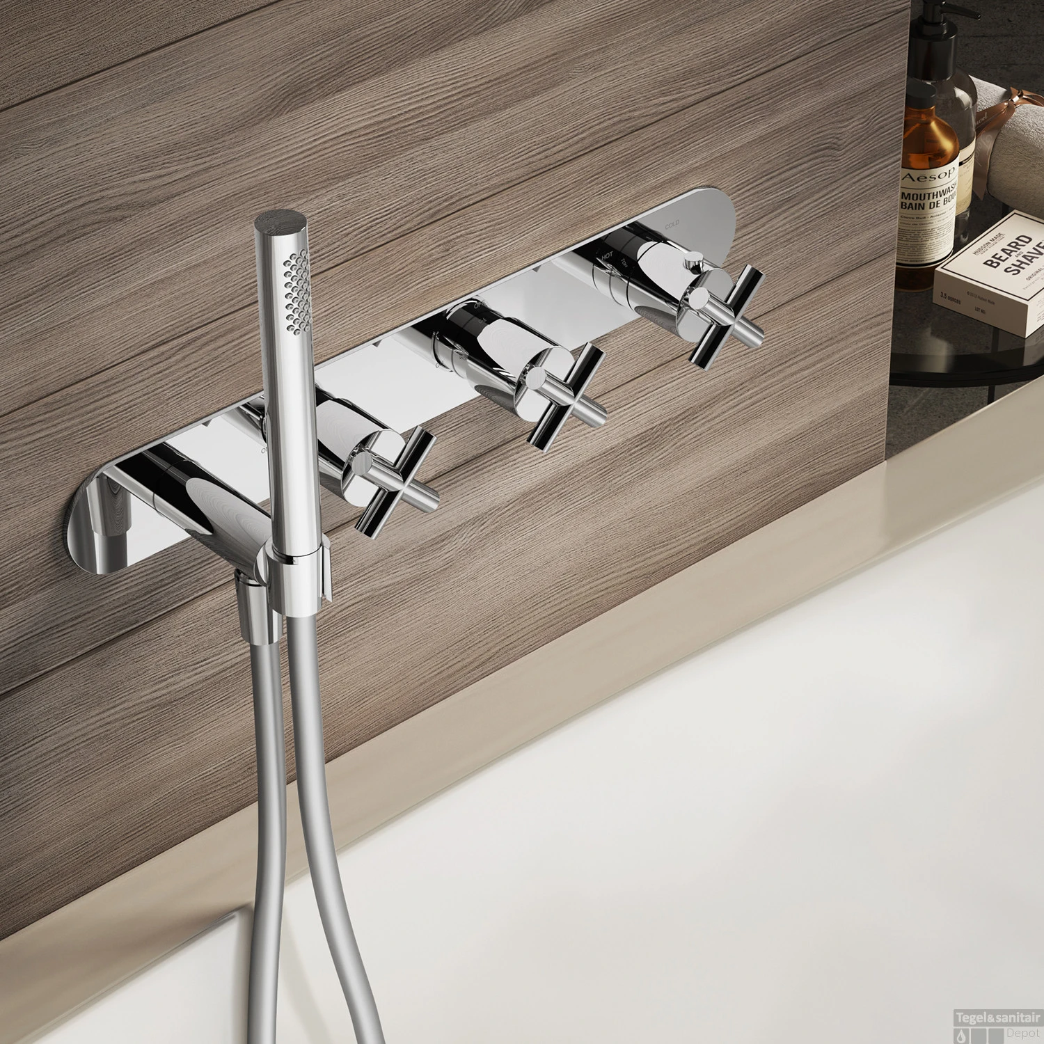 De Chap inbouw thermostaatkraan van het merk Hotbath is een kraan met een geweldig design, die nagenoeg in iedere badkamer past. Doordat de kraan is voorzien van een unieke kruisgreep, kunt u de badkraan comfortabel en nauwkeurig bedienen.
