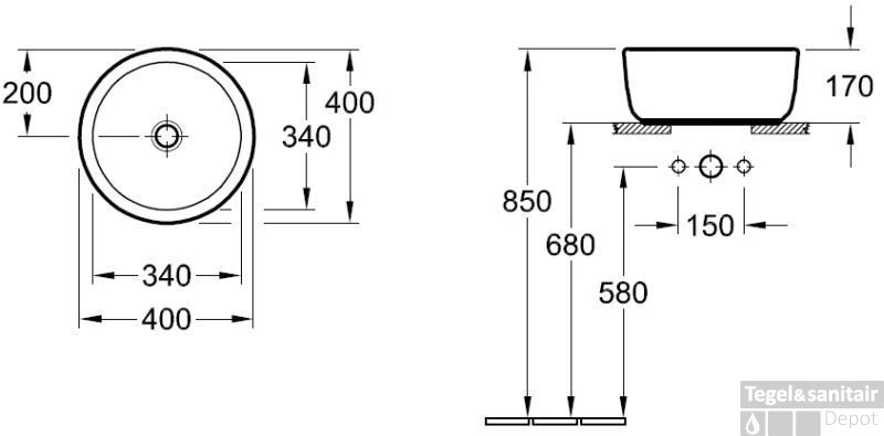 Opzetwastafel rond 40 cm. z/kraangat m/overloop