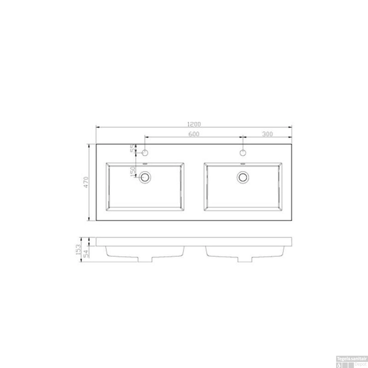 De wastafel heeft een breedte van 120 cm, een diepte van 47 cm en een hoogte van 5 cm.
